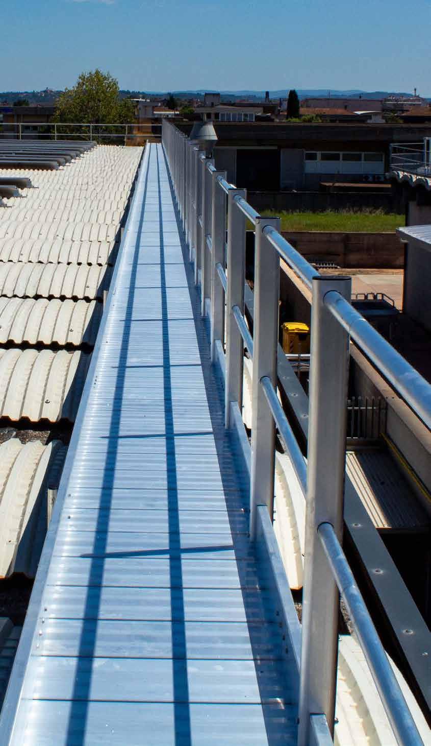 Le passerelle SDWALK sono progettate secondo la norma UNI 14122:2016 per creare corridoi di passaggio sicuri e facili da installare. Realizzate in alluminio estruso 6060 T6, offrono elevata resistenza meccanica e agli agenti atmosferici. Le matrici per l’estrusione sono state sviluppate internamente per garantire conformità alle normative vigenti.