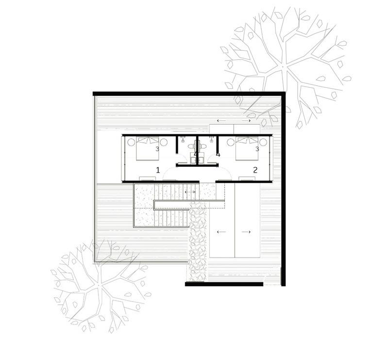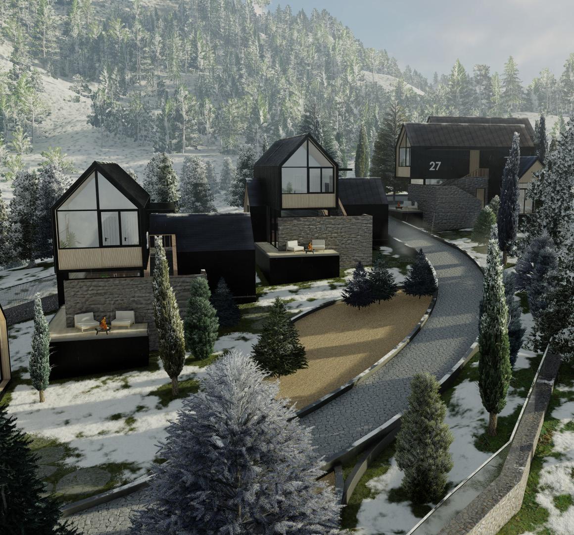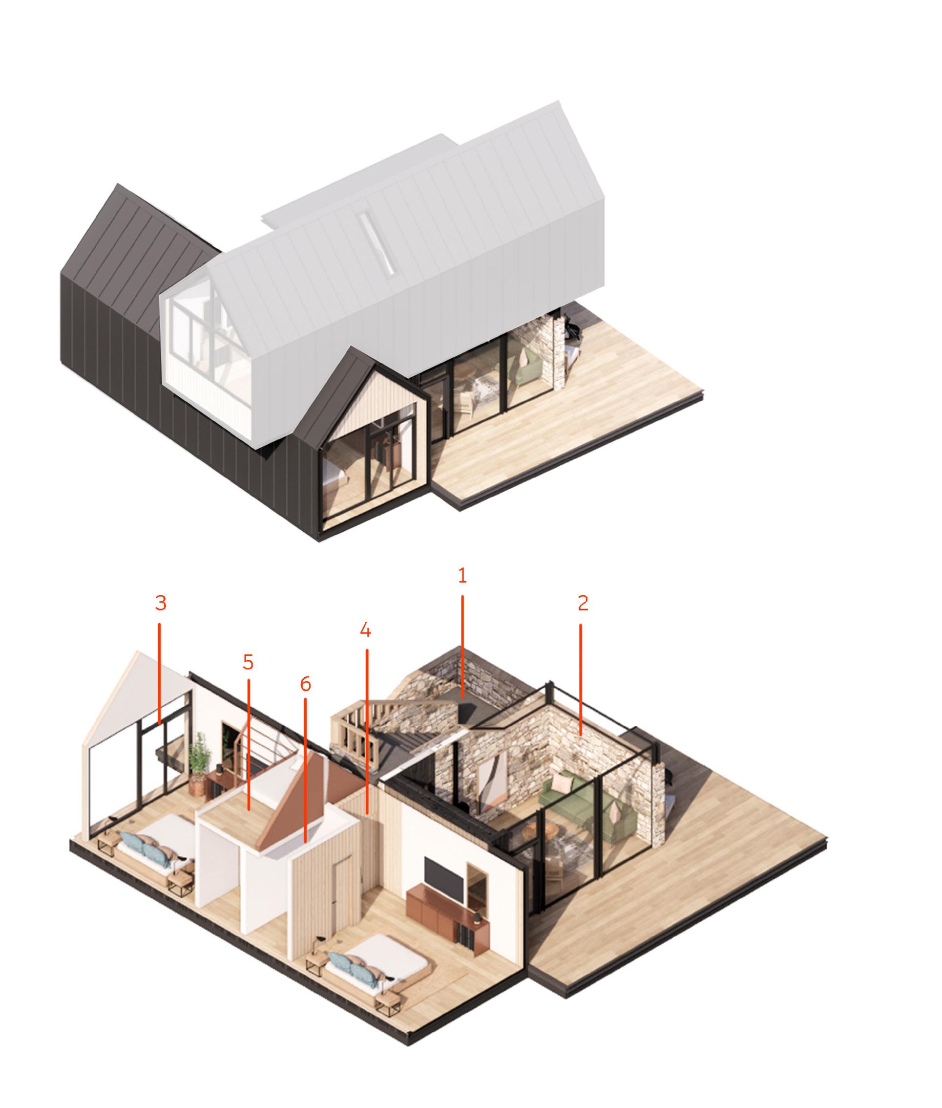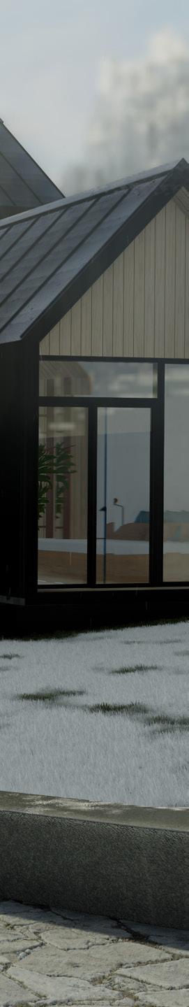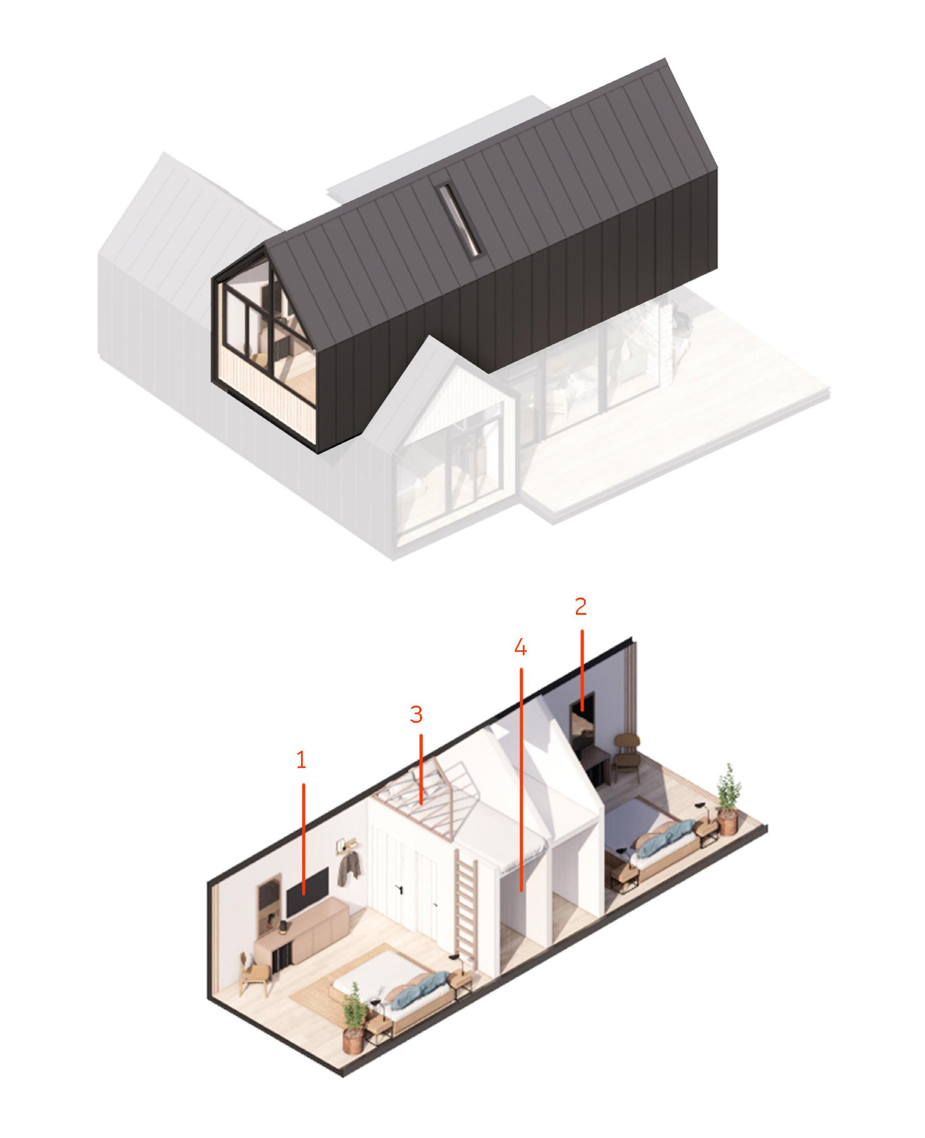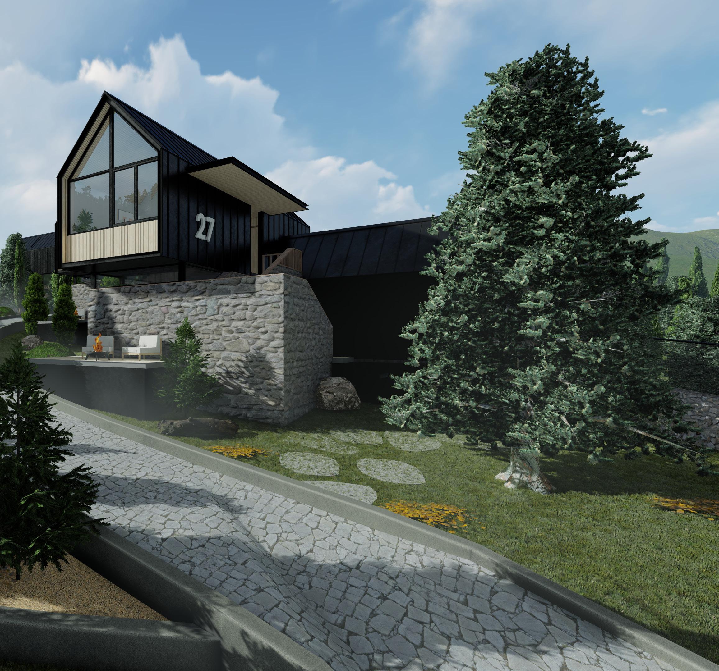 The overall master plan lays out the proposed modular structures along an organic path that follows the narrow site. The site’s contours gradually descend towards the end of the property. The modularity and strategic glazing placement of the structures provide flexibility in their orientation, allowing for optimal alignment with the views and sun exposure.