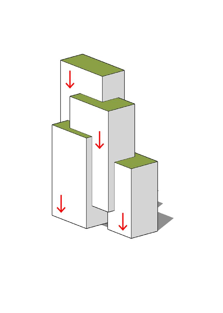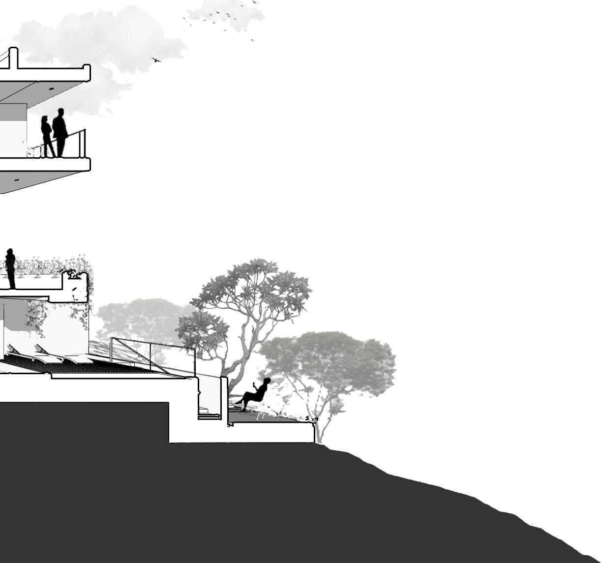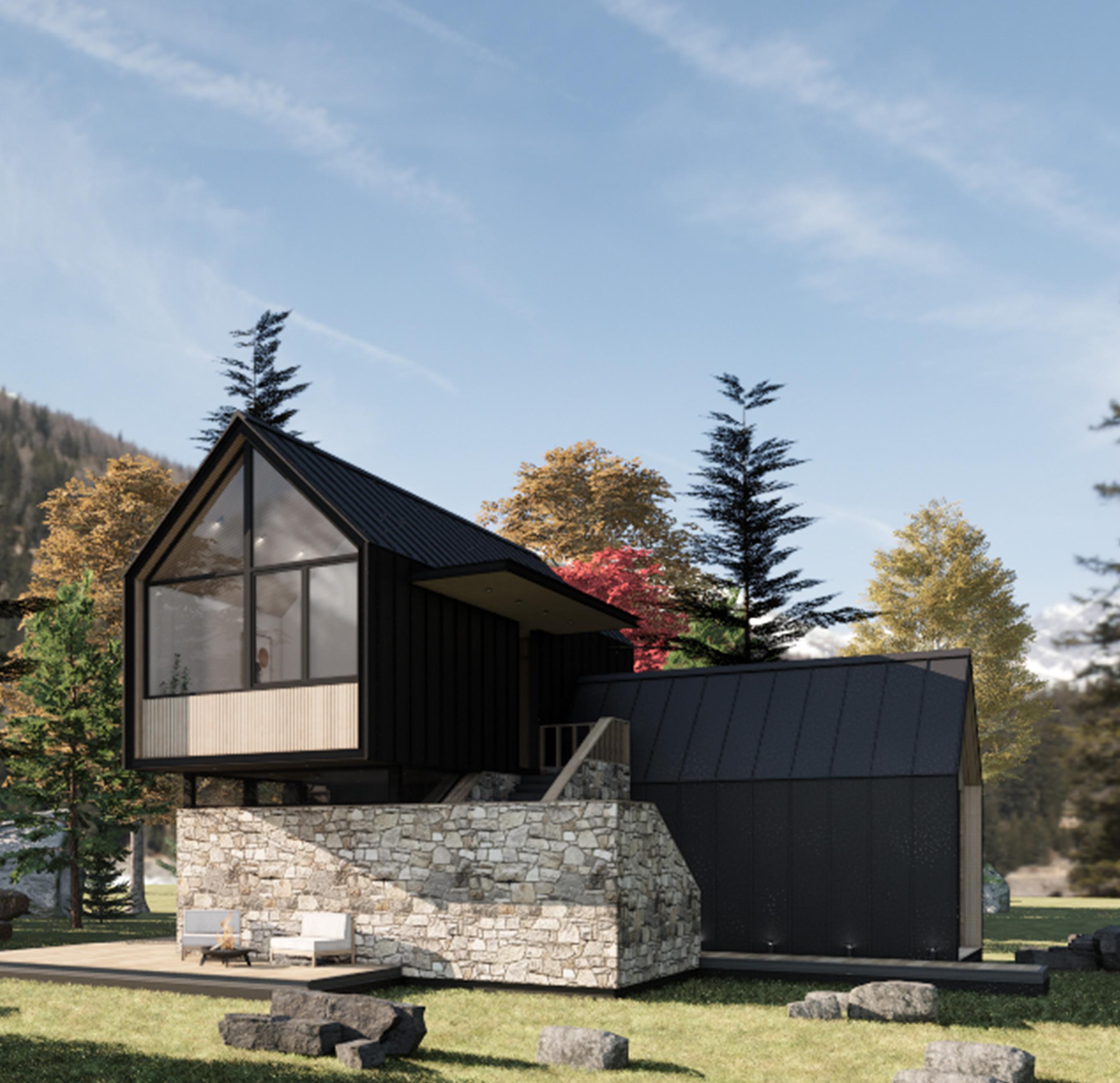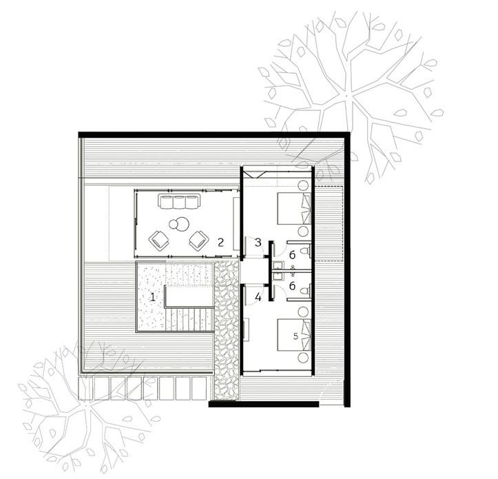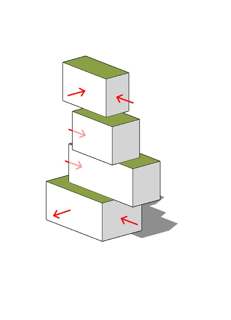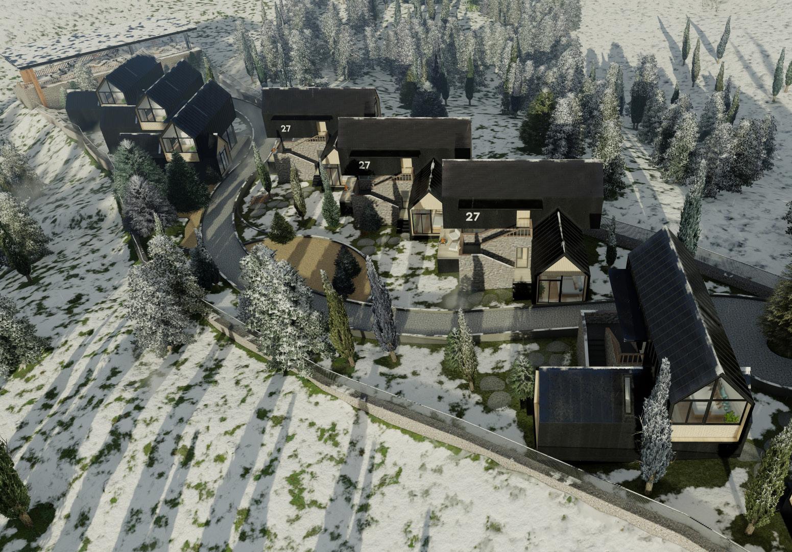 The overall master plan lays out the proposed modular structures along an organic path that follows the narrow site. The site’s contours gradually descend towards the end of the property. The modularity and strategic glazing placement of the structures provide flexibility in their orientation, allowing for optimal alignment with the views and sun exposure.