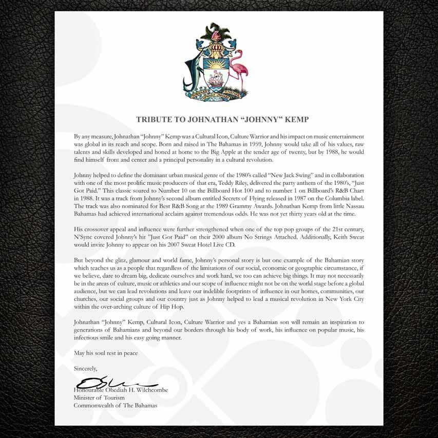 Johnny Kemp was an ambassador who publically displayed a genuine love for his Bahamian country! He announced his Bahamian heritage at every opportunity, and would always include some mention of the Bahamas on interviews and performances. He described the Bahamas as a calm, sweet and loving place to live. His musical talents were instrumental in bringing international recognition to The Bahamas.
