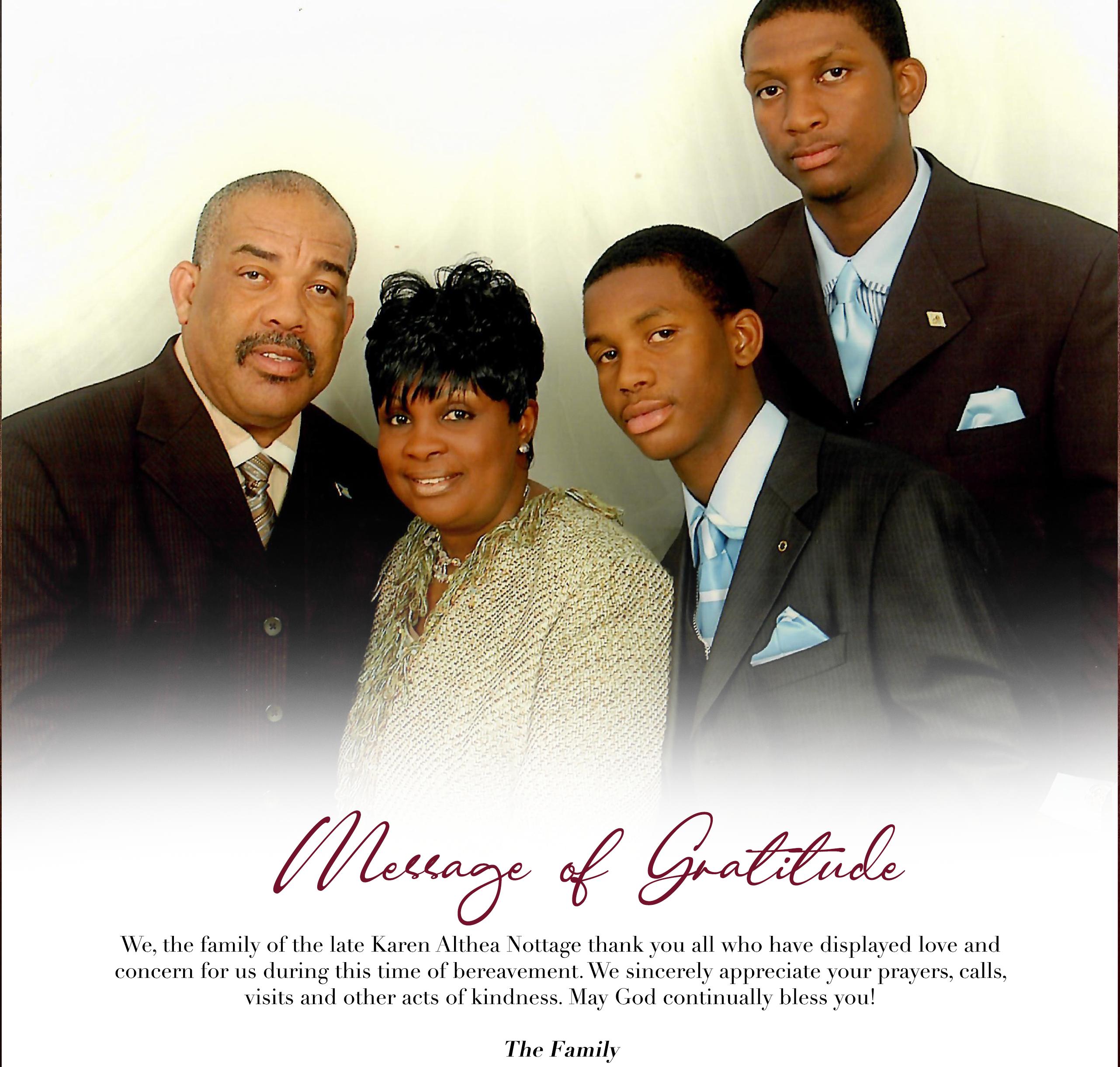Karen Nottage, you left without telling me you were going away and not coming back. You thought nothing was too good for me. You were my biggest cheerleader and earnestly celebrated all my accomplishments. Sleep on my sister take your rest, I know you will hear God say well done my good and faithful servant.