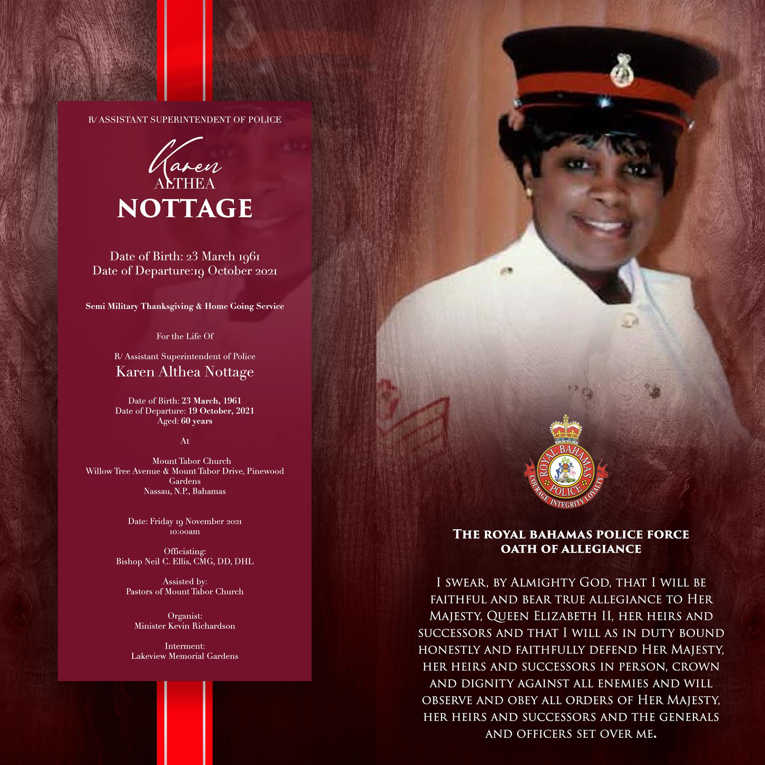 Division, Colette Brown, Lynn Armbrister, Mr. & Mrs. Ruben McDonald, Ms. Eugie Nixon & family, Mr. & Mrs. Christopher & Harriet Wallace, W/Cpl 2485, Ann Wilson, Mr. & Mrs. Edmund Stubbs, W/ Sgt 1545 Johnson, Faye Smith, The Bonamy family, Inspector Geniece Barr, Melanie Moxey, Princess Delaney, Elder Maxine Newton, Zella Symonette, Mrs. Gwendolyn Colebrooke & family, Sherry Fountain & Family, Janet Serrette and family, Cpl 1200 Bastian, PC 3288 Agenor, WPC 4209 Amanda Brown, R/ Insp. Marilyn Thompson, Honorable Leonardo Lightbourne, Honorable McKell Bonaby, Ms. Keylisa Thompson, Mr. Ricardo King, Elder Jacqueline Gibson, Elder Jacqueline Knowles, Pastor Vernita Josey, Lauretta Marshall, Pastor Lionel Rolle & family, Pastor Lorenza Clarke & family, Pastor Perry Ferguson & family, Pastor Jason Graham & family, Bishop Helen McPhee & family, Pastor Reginald Cox & family, Pastor Richard Gibson & family, Bishop Gregory Minnis, Bishop Christopher Minnis and family, Mr. & Mrs. Michael Ellis & family, Ret. Deputy Commissioner of Police Keith Mason, Ret. Assistant Commissioner of Police Emerick Seymour, Rt. Assistant Commissioner of Police Steven Seymour, Ret. Superintendent of Police Roosevelt Curry & Mrs. Curry, Ch/ Superintendent of Police Shanta Knowles, Commissioner of Police Mr. Paul Rolle & the entire Royal Bahamas Police Force, Mt. Tabor Church family, Global United Fellowship family, Dunamis Outreach Ministries family, House of Elijah, Staff Antiquities Monuments & Museums Corporations, Director & Staff of The Financial Intelligence Unit, Kiwanis Club of Over The Hill, Prince Lock & Key Company, The communities of Stapledon Gardens and 5th Street Coconut Grove, CC Sweeting Sr. High Class of 1978 and Ritchie & The Domino Boys Minister Sherice Ferguson, Sade Wallace, Antionette Culmer, Staff of Oncology Consultants.