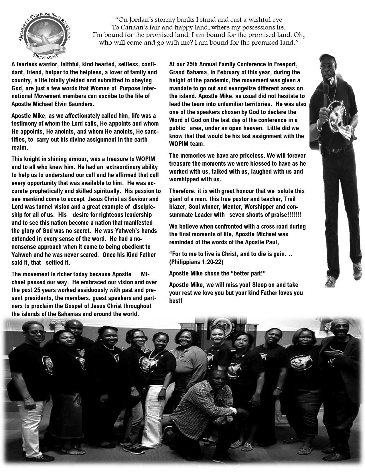 Michael love for God, people and country moved him to offer himself for Local Government; leader of the Bahamian Way Forward Movement (BWFM); Kiwanis; Soaring Eagles; Toastmasters; Neighborhood Police Watch and so much more.
