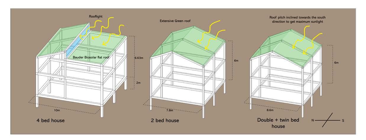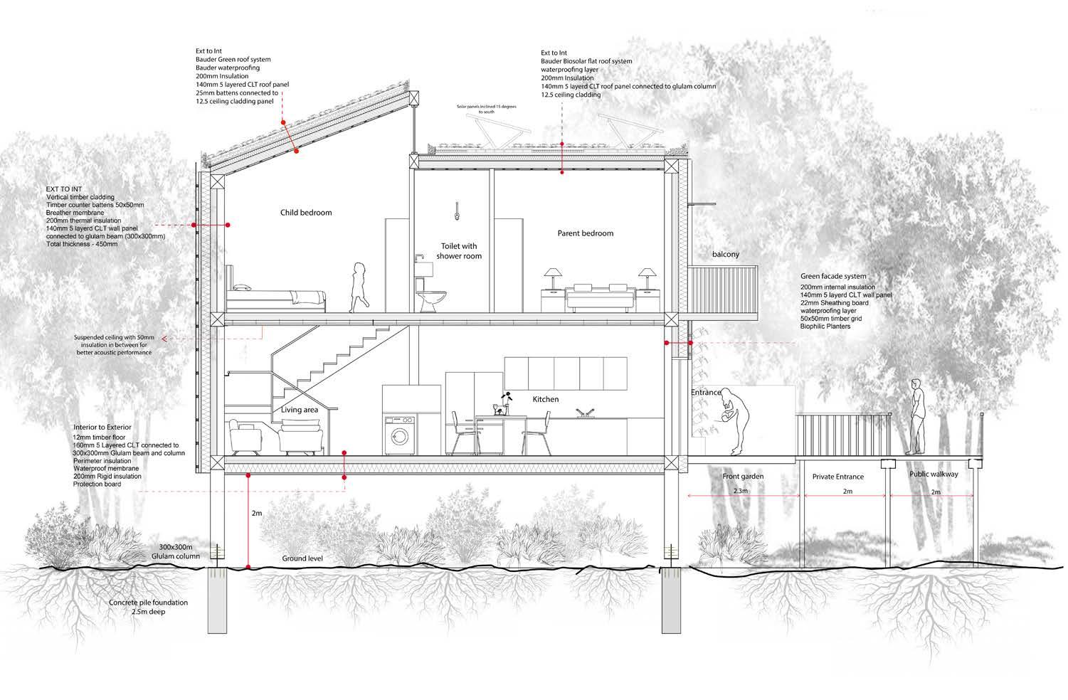 Front garden Private access 2m wide common pathway connecting row of houses Housing unit Ground level Houses elevated 2m above ground level Housing unit Front garden Housing unit 7m apart Private access Common pathway 04 BREATHING HOUSES - MASTERPLAN