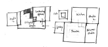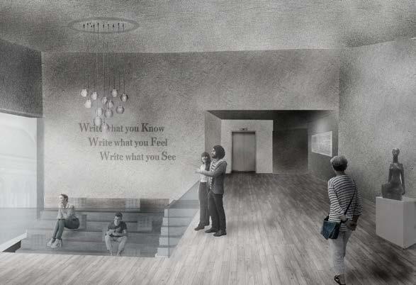 Lower ground floor Ground floor First floor Second floor Entrance Elevator Main Theatre Gathering hall Sculpting studio Mezzanine floor office Writing studio Accommodation Exhibition space Screening hall Kitchen Theatre Lobby Elevator Rehearsal room Back Entrance Backstage Public theatre Vertical movements endpoints Horizontal movement 61 Software - Rhino + Photoshop + Google earth view 8