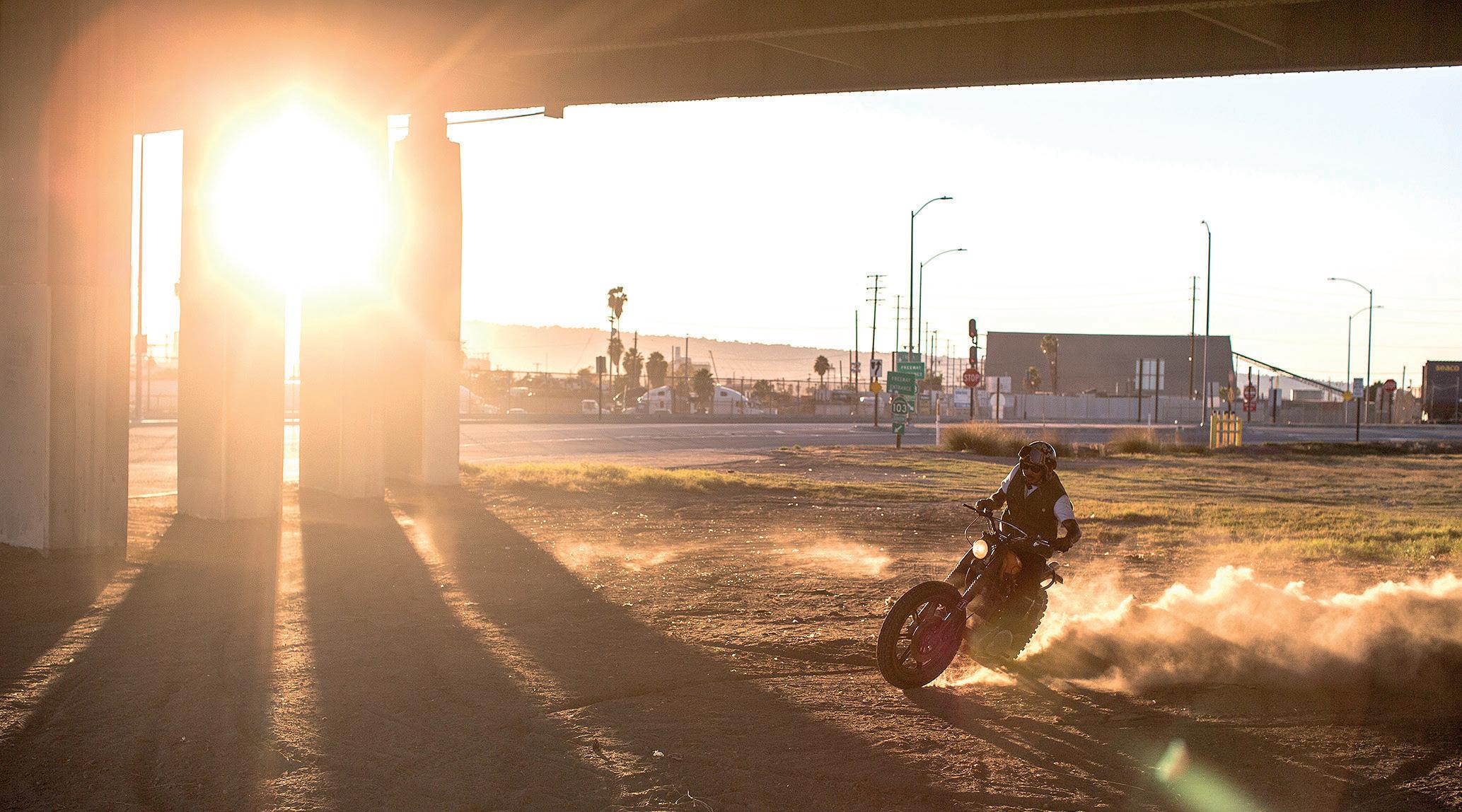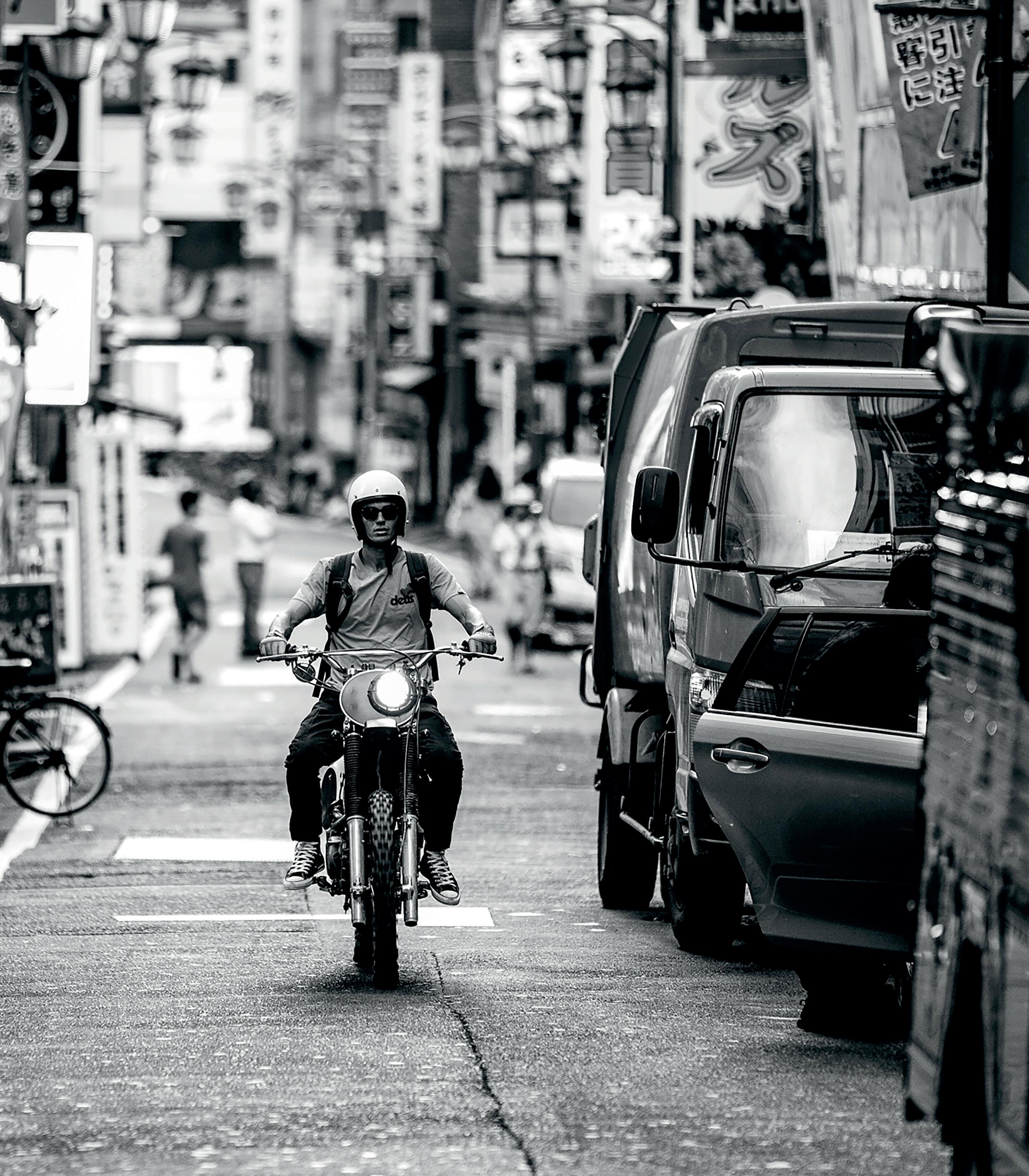 clockwise from top: Franck Casoli under a French overpass, by Bram de Roeck; Harrison Roach navigates Tokyo on a Deus Ex Machina custom Honda XL500, by Harrison Mark; Launch. Control. Nick Apex on Icon’s Triumph Speedmaster, photo by Icon 1000; Jean-François Muguet says, ‘This is Kev from Ace Classics testing a desert sled in London, 2019. You can see the shop in the background, but, unfortunately, the photo can’t show the sound, the rage coming from the bike. No helmet. No nothing. I love Kev.’
