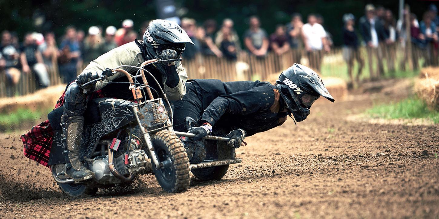 clockwise from above: Who wants it? The Sideburn-sponsored DTRA Vintage class leaving the grid at Greenfield Dirt Track, UK, by Paul France; El Solitario’s mini-sidecar spits Spanish dirt at El Rollo, by Fabio Affuso; Kazuo Fukudo of Buddy Custom Cycles, Japan, battles with Dimitri Coste at El Rollo in 2019.