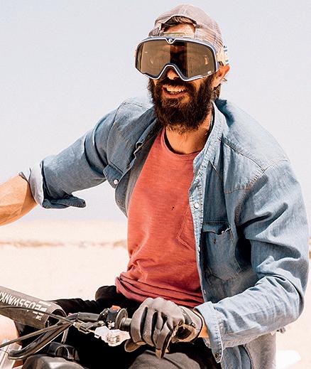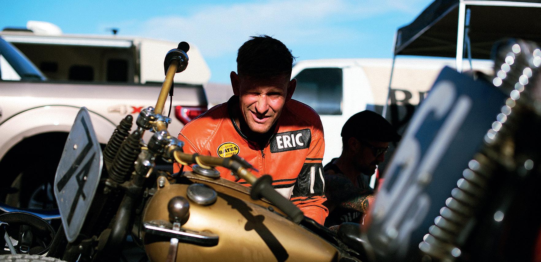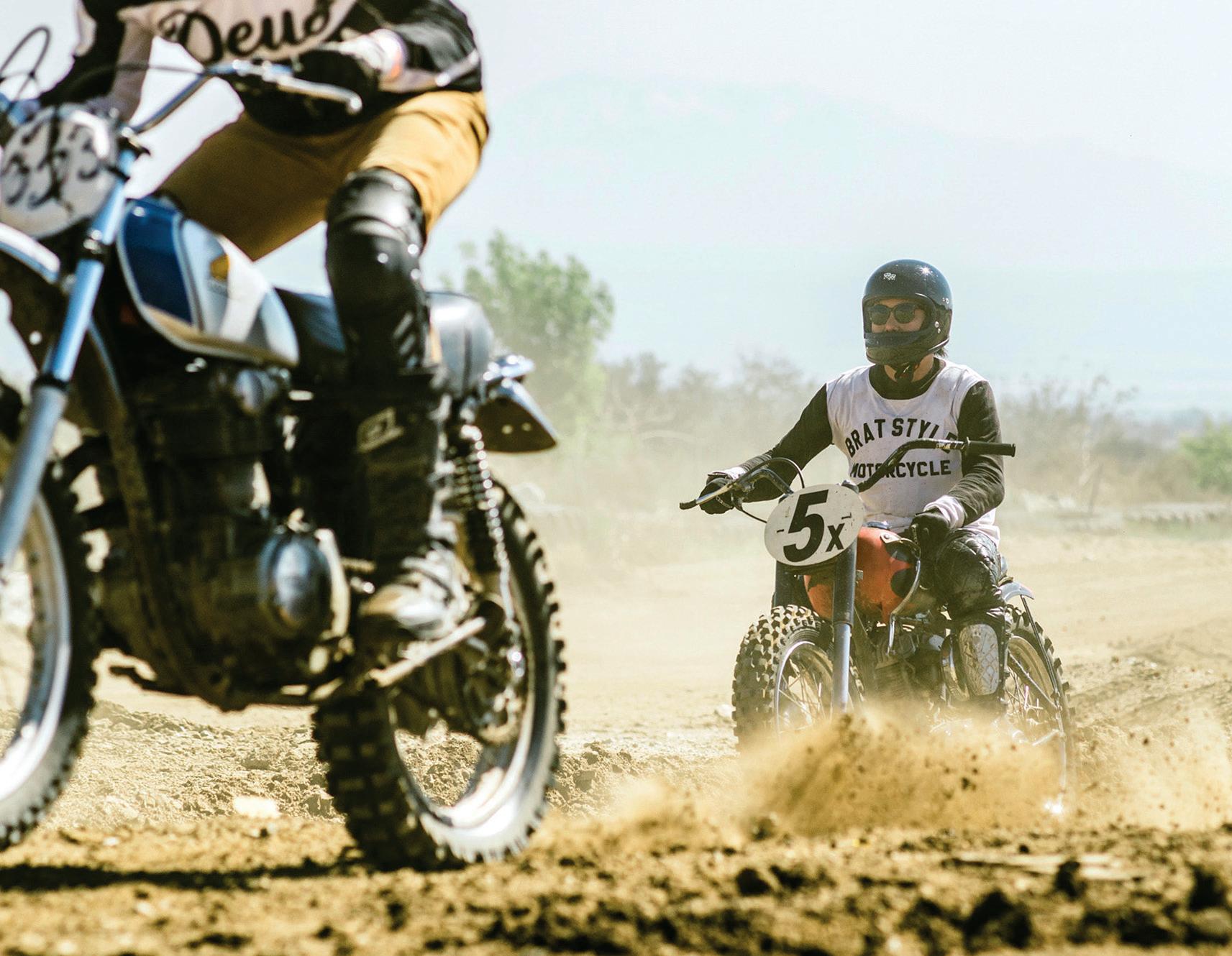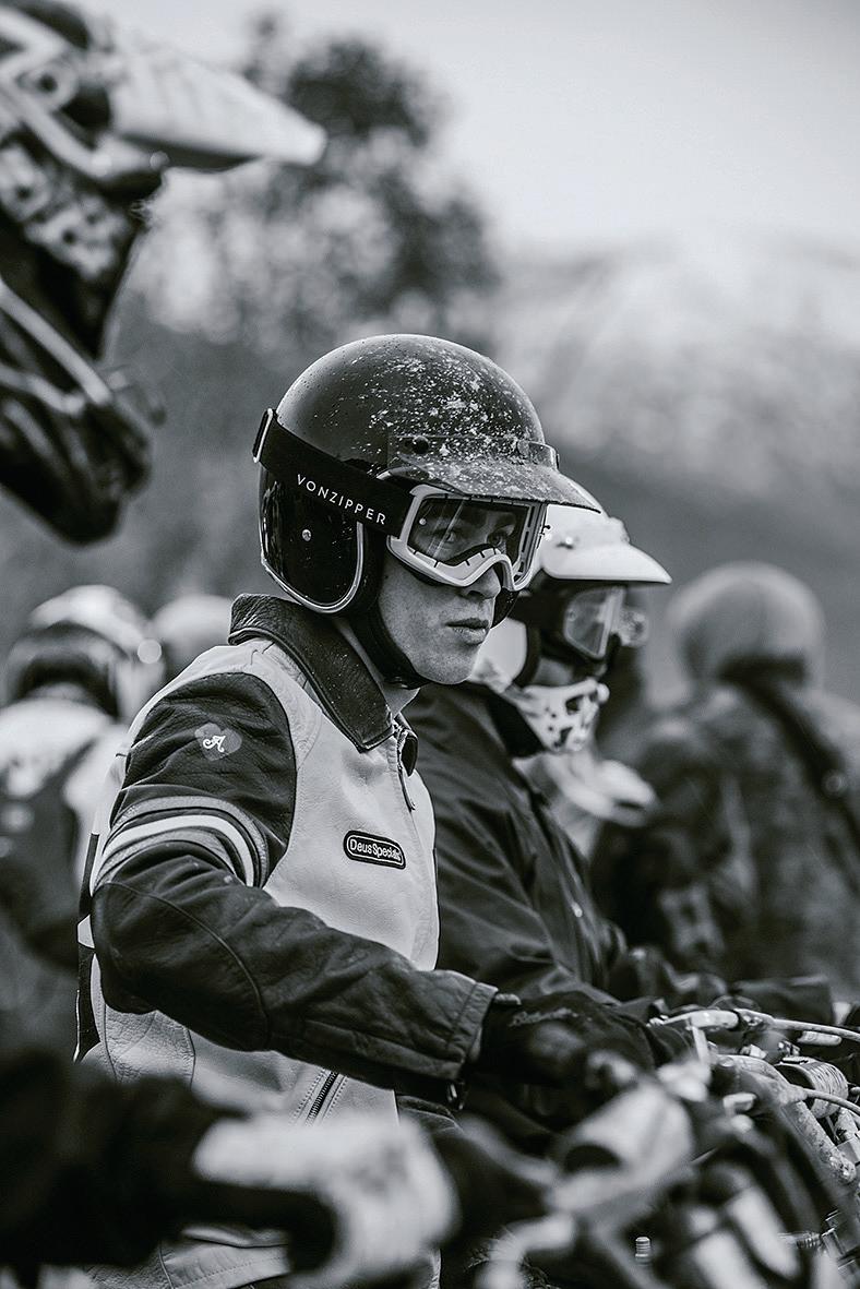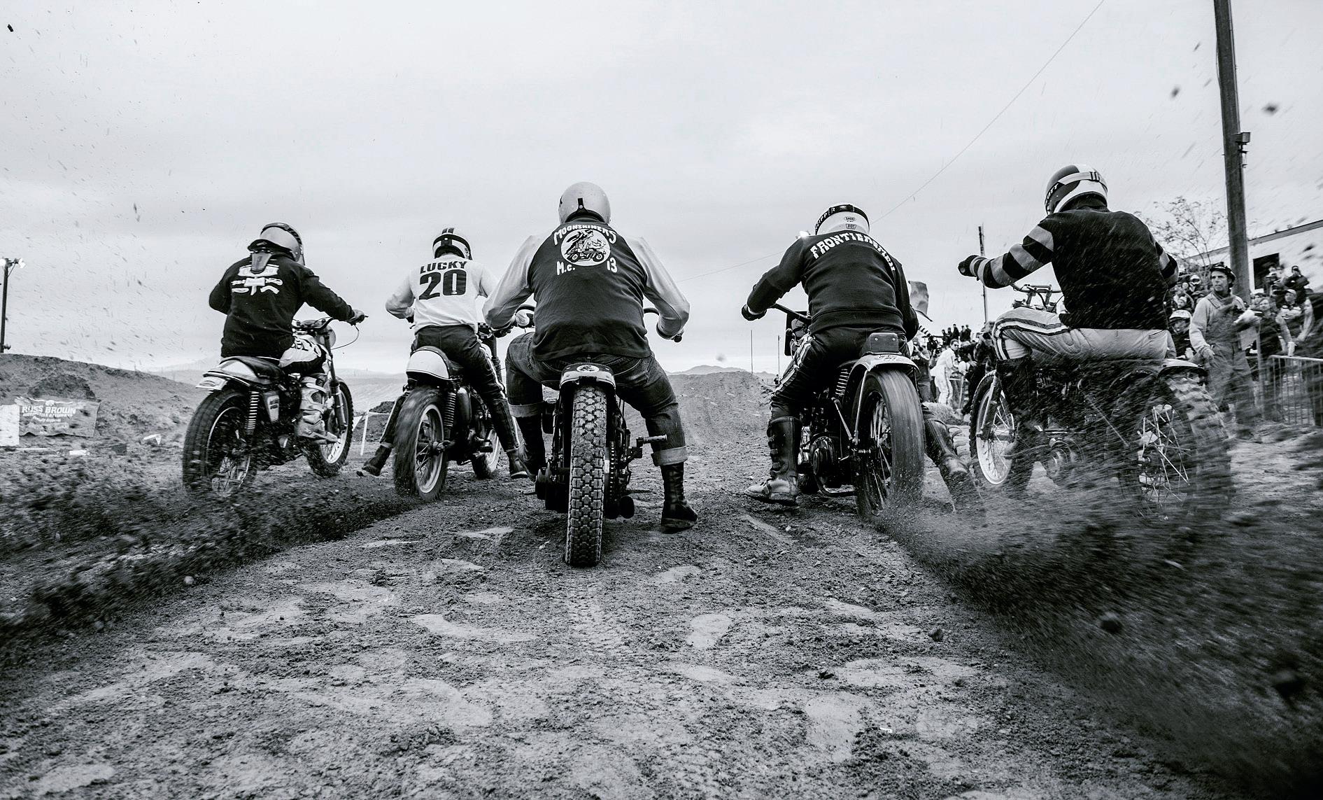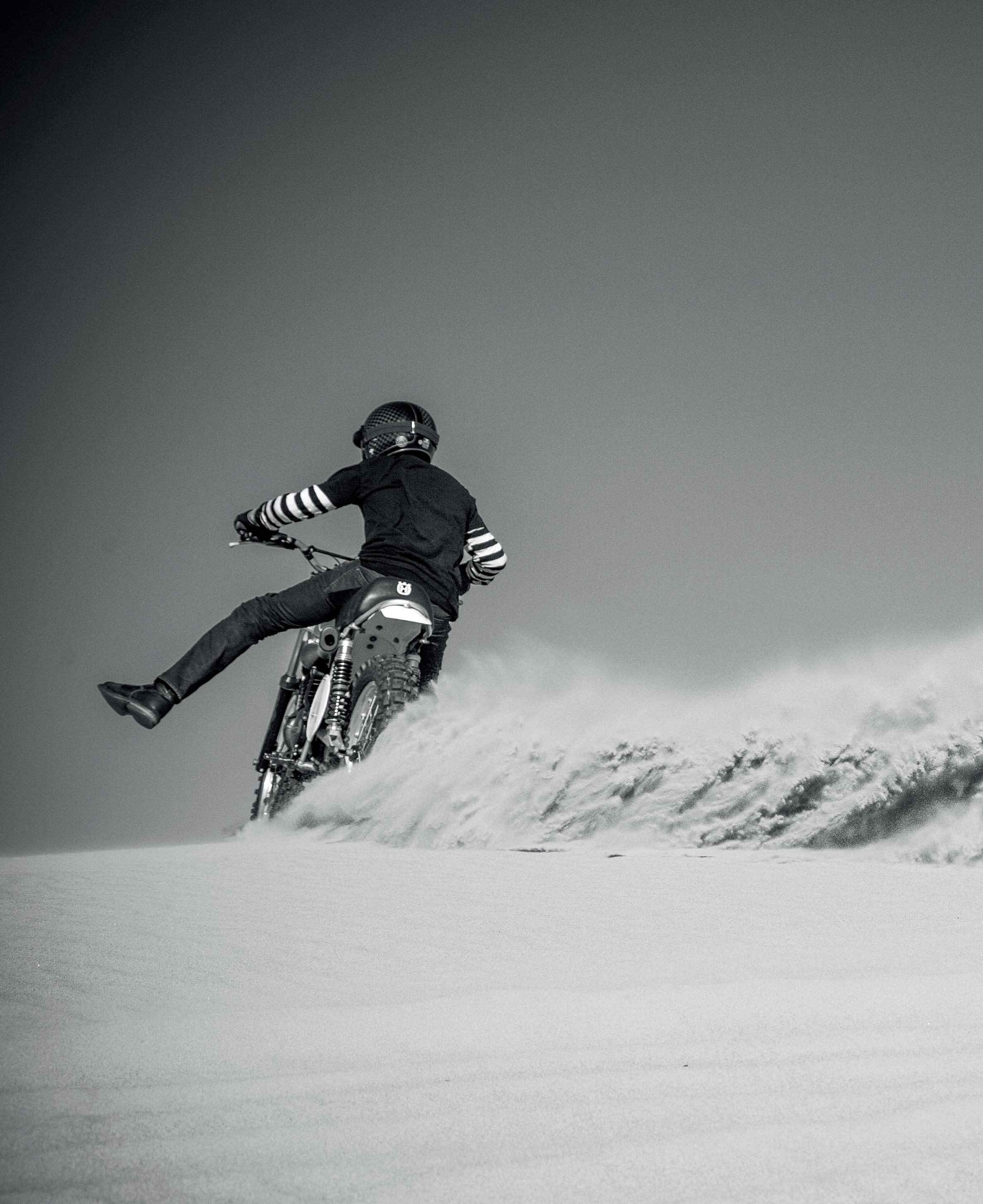 Tiger 900 Rallys, by Grant Evans; Blasting the berm on a big Beemer, Metcalf Motorcycle Park, CA, by Erik Jutras; Underground car park beers for the LABarstow to Vegas finishers, by Scott Toepfer. That’s Scott’s BSA with the tank bungeed on. It had endured a tough couple of days; Post-work riding lessons on a Bali beach for some of the Deus Ex Machina crew, by Harrison Mark; Geoff Kowalchuk grabs Biltwell’s Bill hoisting the front wheel of his Yamaha TT500, Ridgecrest, CA; Road tripping Jebel Jais, UAE, by Fabio Affuso previous page Roland Sands, Pismo Beach, CA, by Joe Hitzelberger