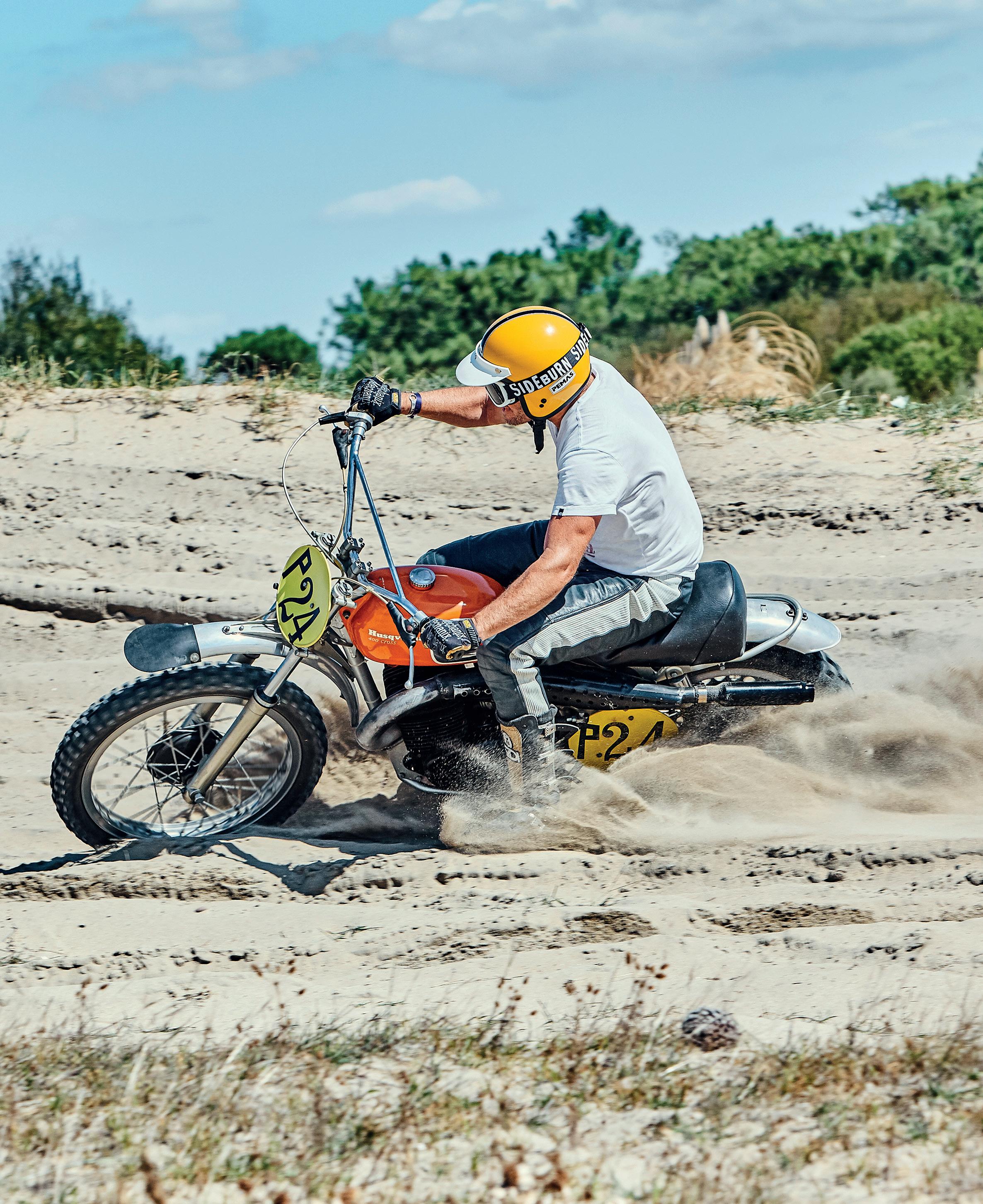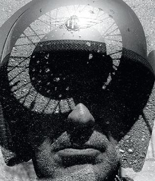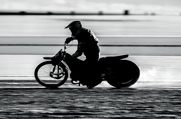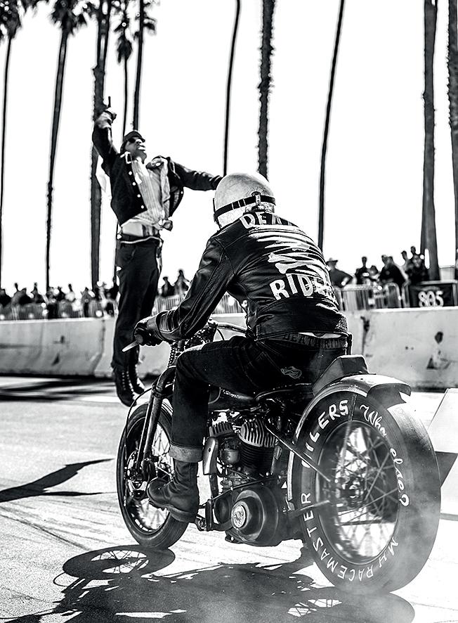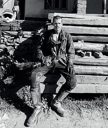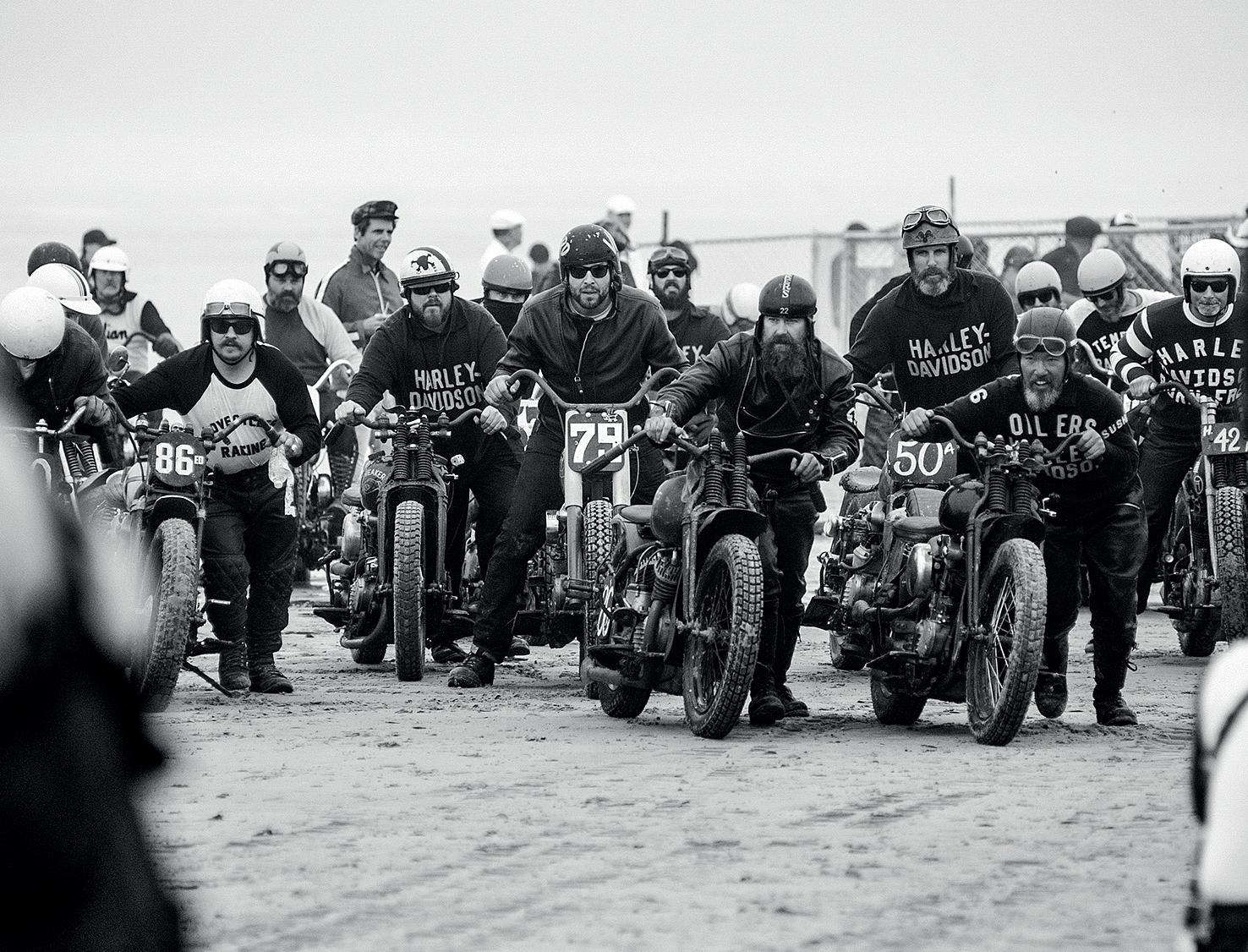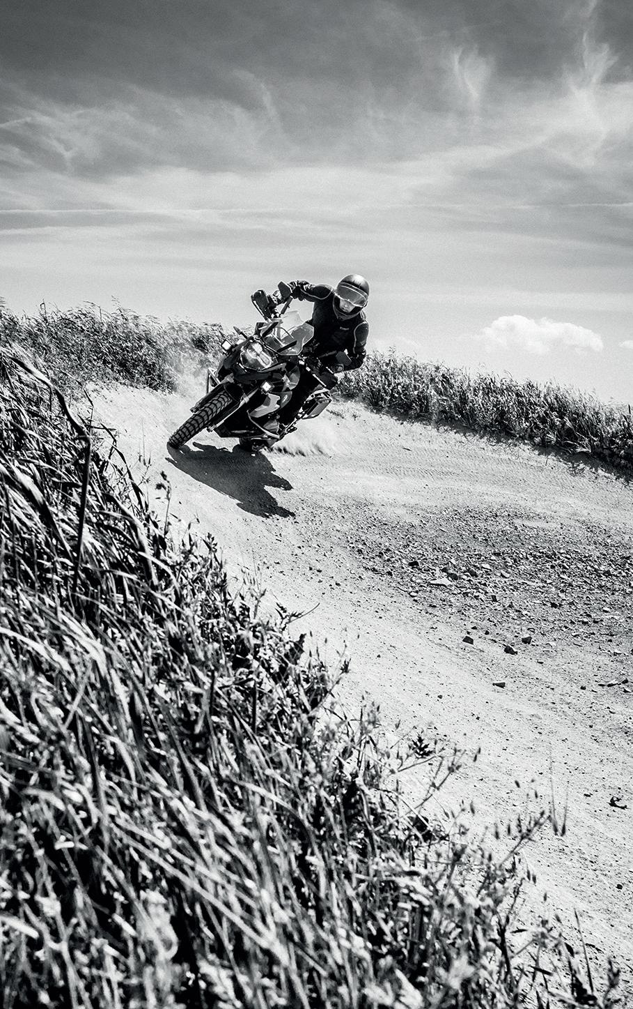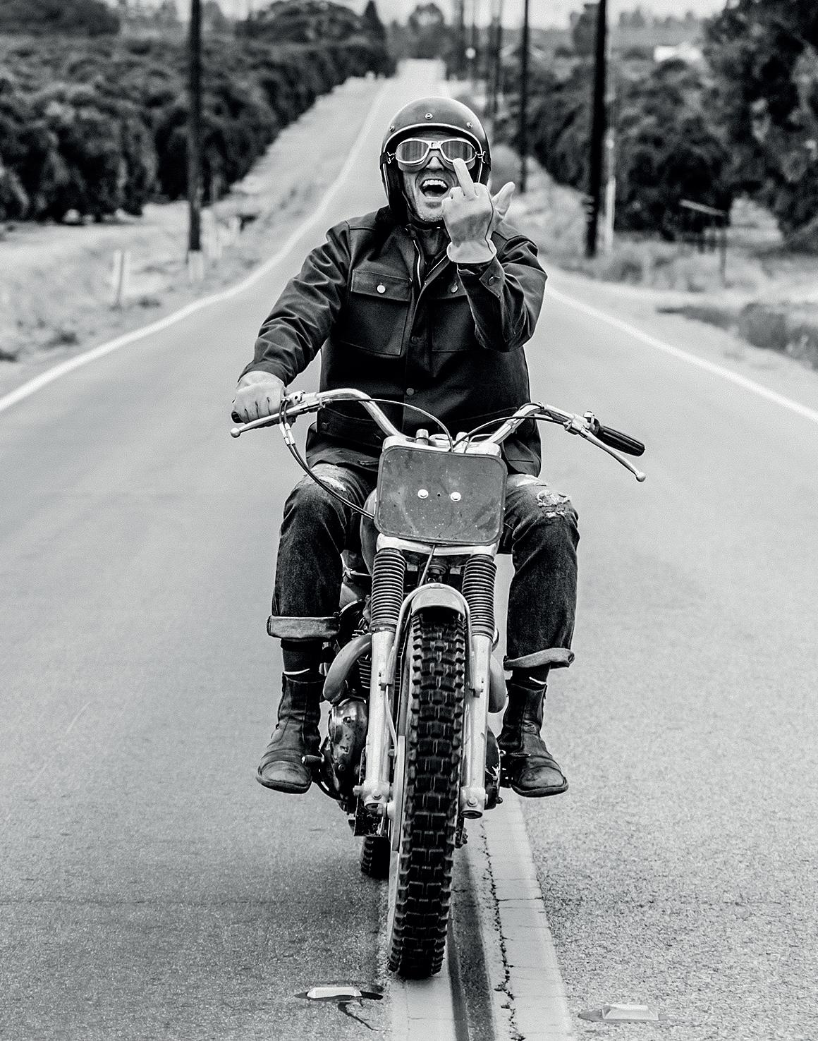 Tiger 900 Rallys, by Grant Evans; Blasting the berm on a big Beemer, Metcalf Motorcycle Park, CA, by Erik Jutras; Underground car park beers for the LABarstow to Vegas finishers, by Scott Toepfer. That’s Scott’s BSA with the tank bungeed on. It had endured a tough couple of days; Post-work riding lessons on a Bali beach for some of the Deus Ex Machina crew, by Harrison Mark; Geoff Kowalchuk grabs Biltwell’s Bill hoisting the front wheel of his Yamaha TT500, Ridgecrest, CA; Road tripping Jebel Jais, UAE, by Fabio Affuso previous page Roland Sands, Pismo Beach, CA, by Joe Hitzelberger