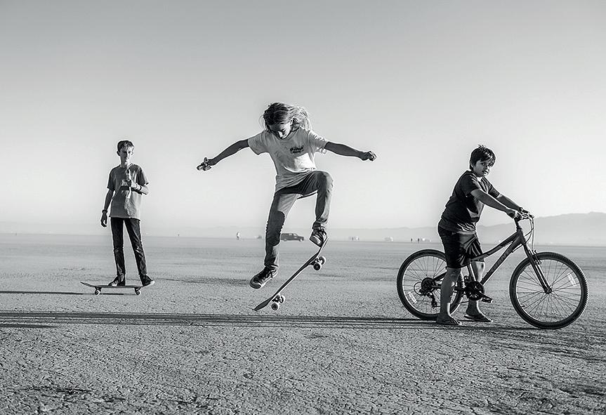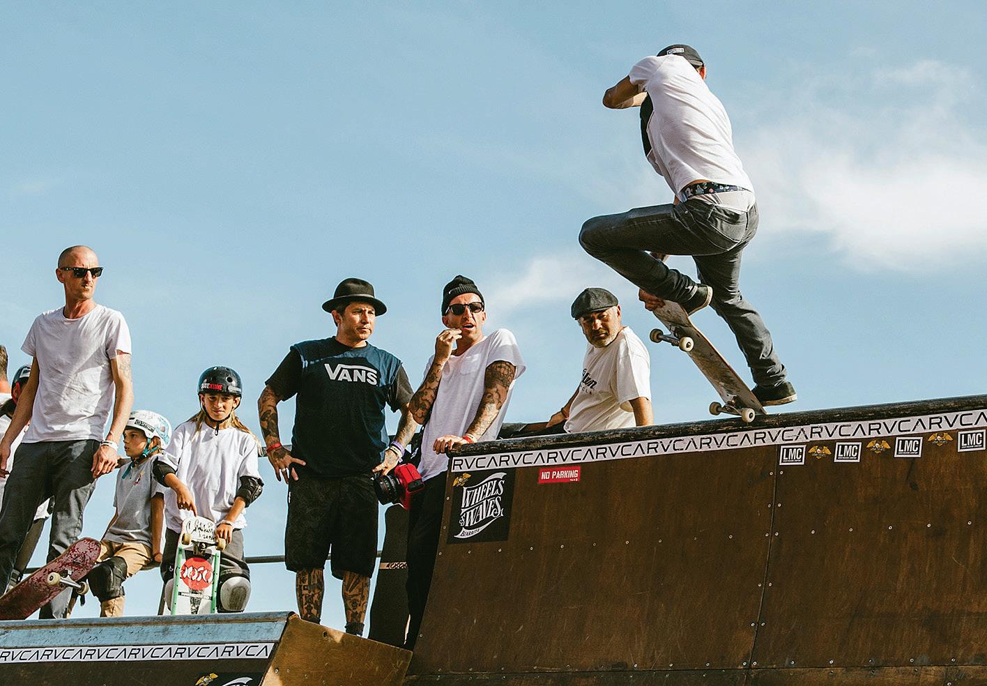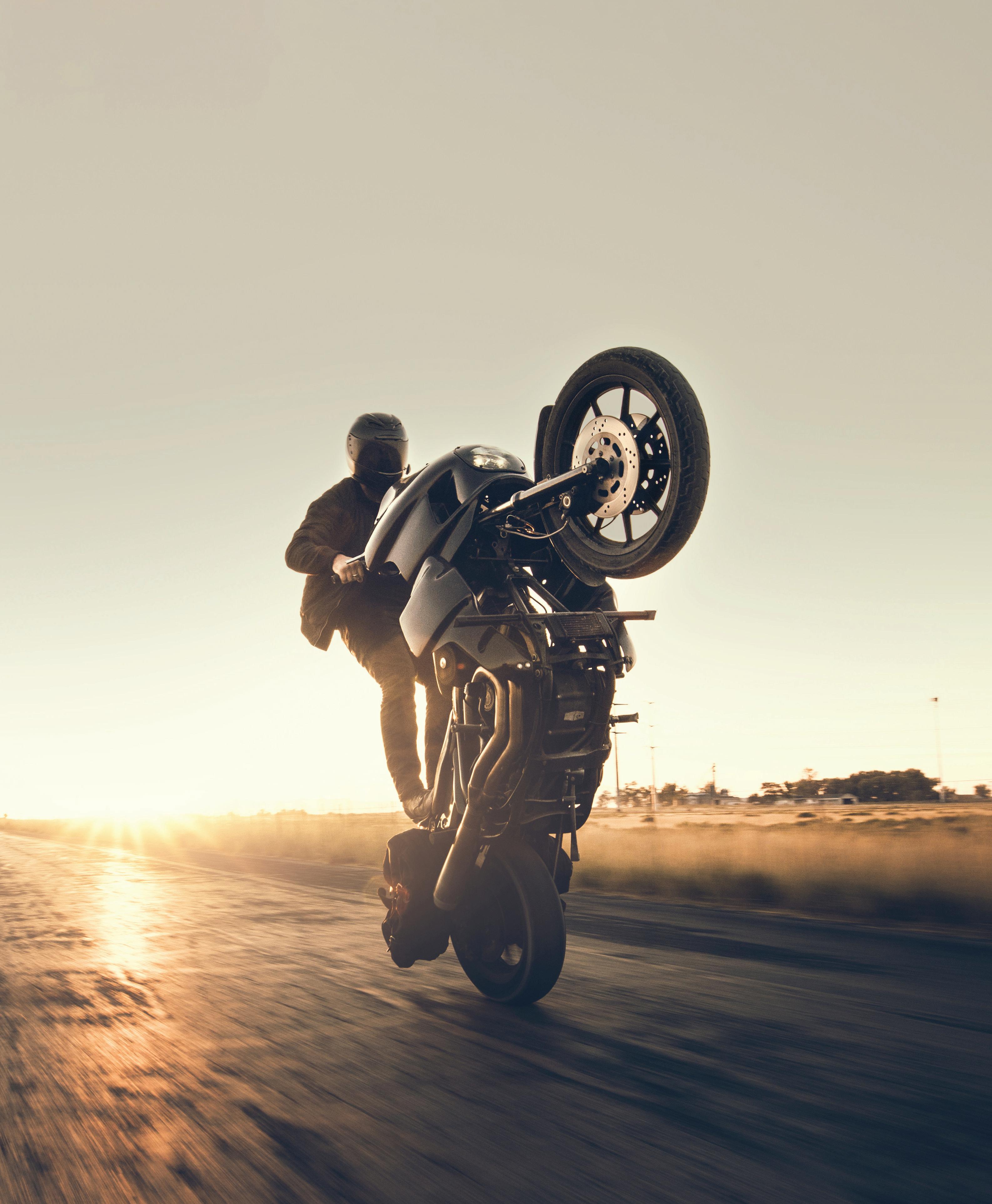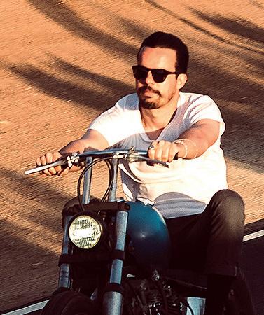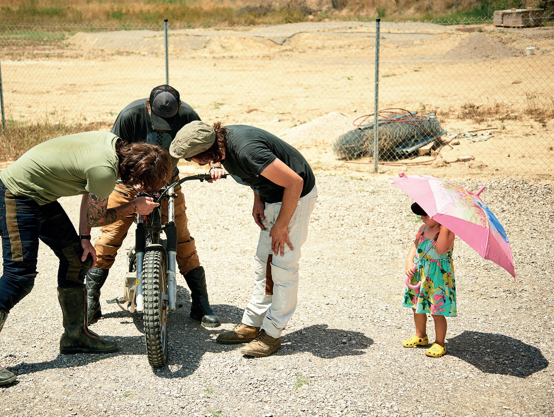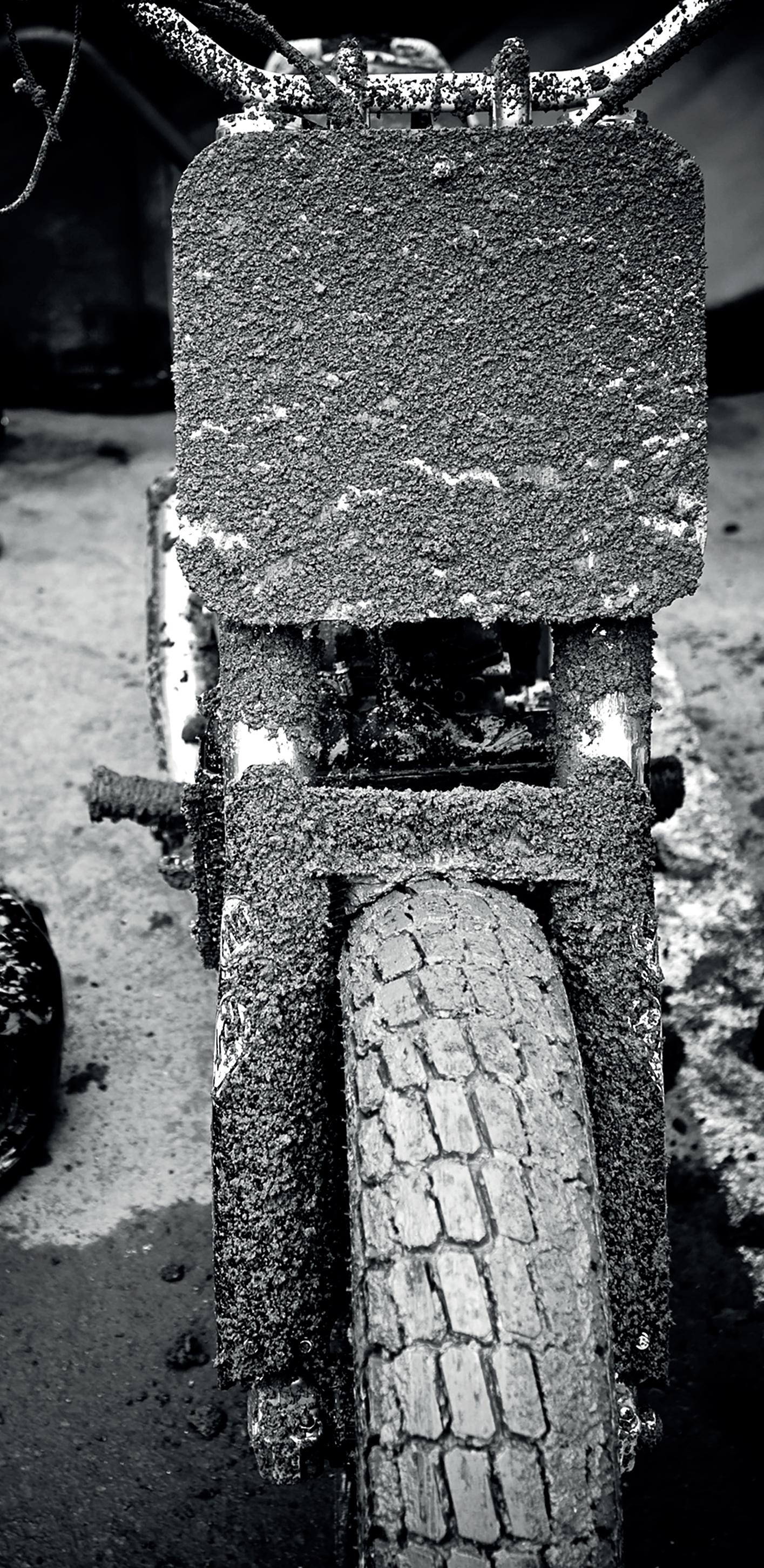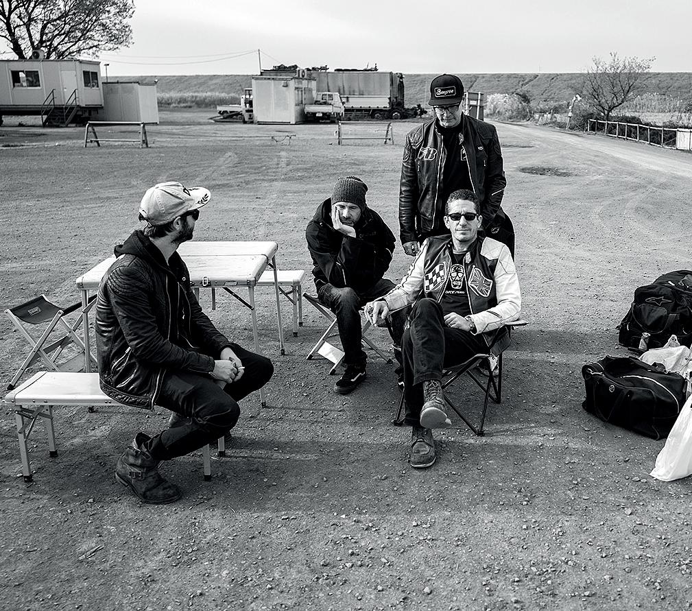 Tiger 900 Rallys, by Grant Evans; Blasting the berm on a big Beemer, Metcalf Motorcycle Park, CA, by Erik Jutras; Underground car park beers for the LABarstow to Vegas finishers, by Scott Toepfer. That’s Scott’s BSA with the tank bungeed on. It had endured a tough couple of days; Post-work riding lessons on a Bali beach for some of the Deus Ex Machina crew, by Harrison Mark; Geoff Kowalchuk grabs Biltwell’s Bill hoisting the front wheel of his Yamaha TT500, Ridgecrest, CA; Road tripping Jebel Jais, UAE, by Fabio Affuso previous page Roland Sands, Pismo Beach, CA, by Joe Hitzelberger