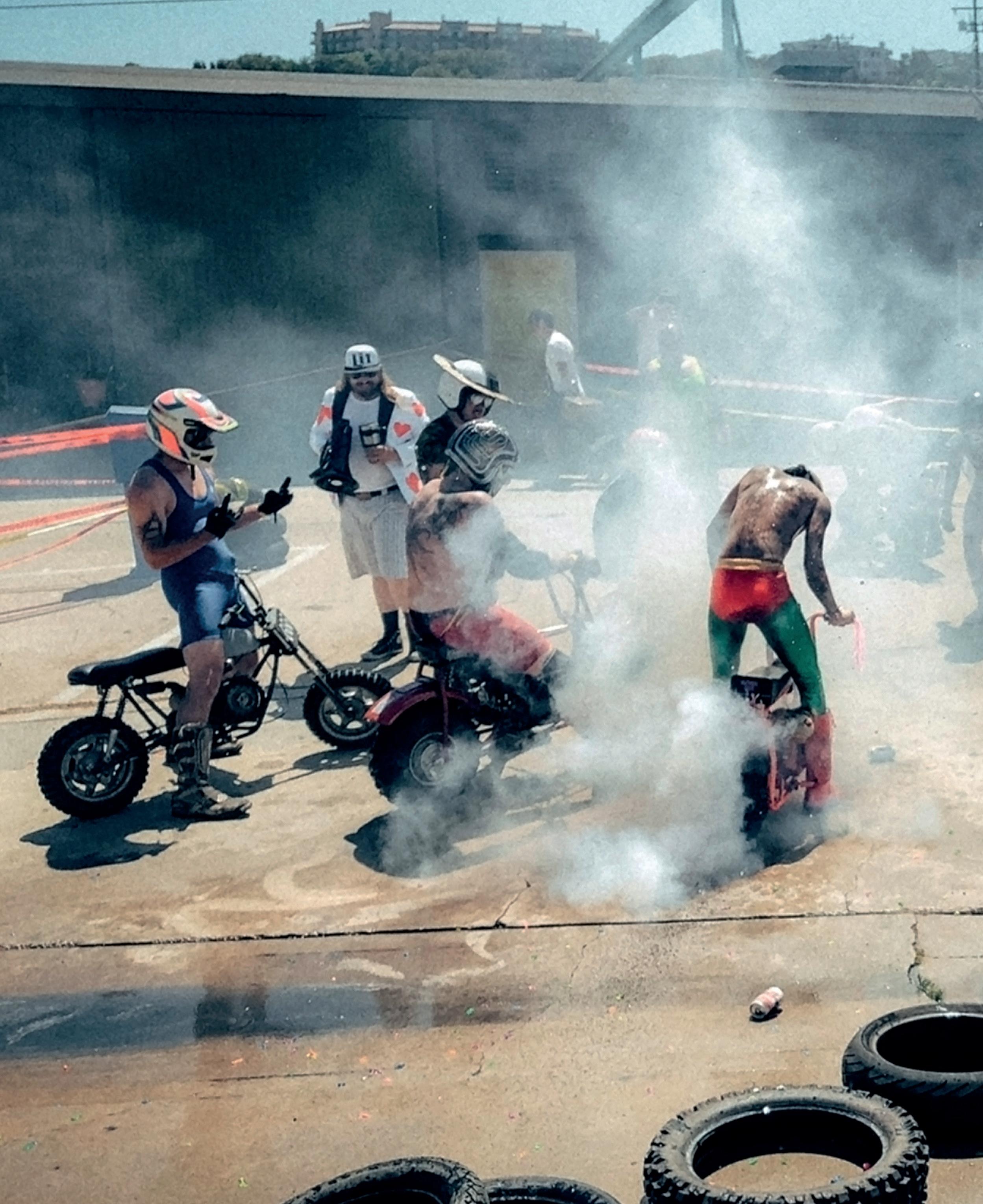 clockwise from above: Daniel on his Derbi at Dusty Track; Portugal, by Manuel Portugal; TROG’s iconic flagger Sara Francello, Wildwood, NJ, by Nicolas Prado; Hagerstown, 2011, by Yve Assad; Inappropriate Bikes, One Pro Race, 2019, by James Wiklund; Swank Rally, by Marco Renieri; Peak performance, by Marco Renieri