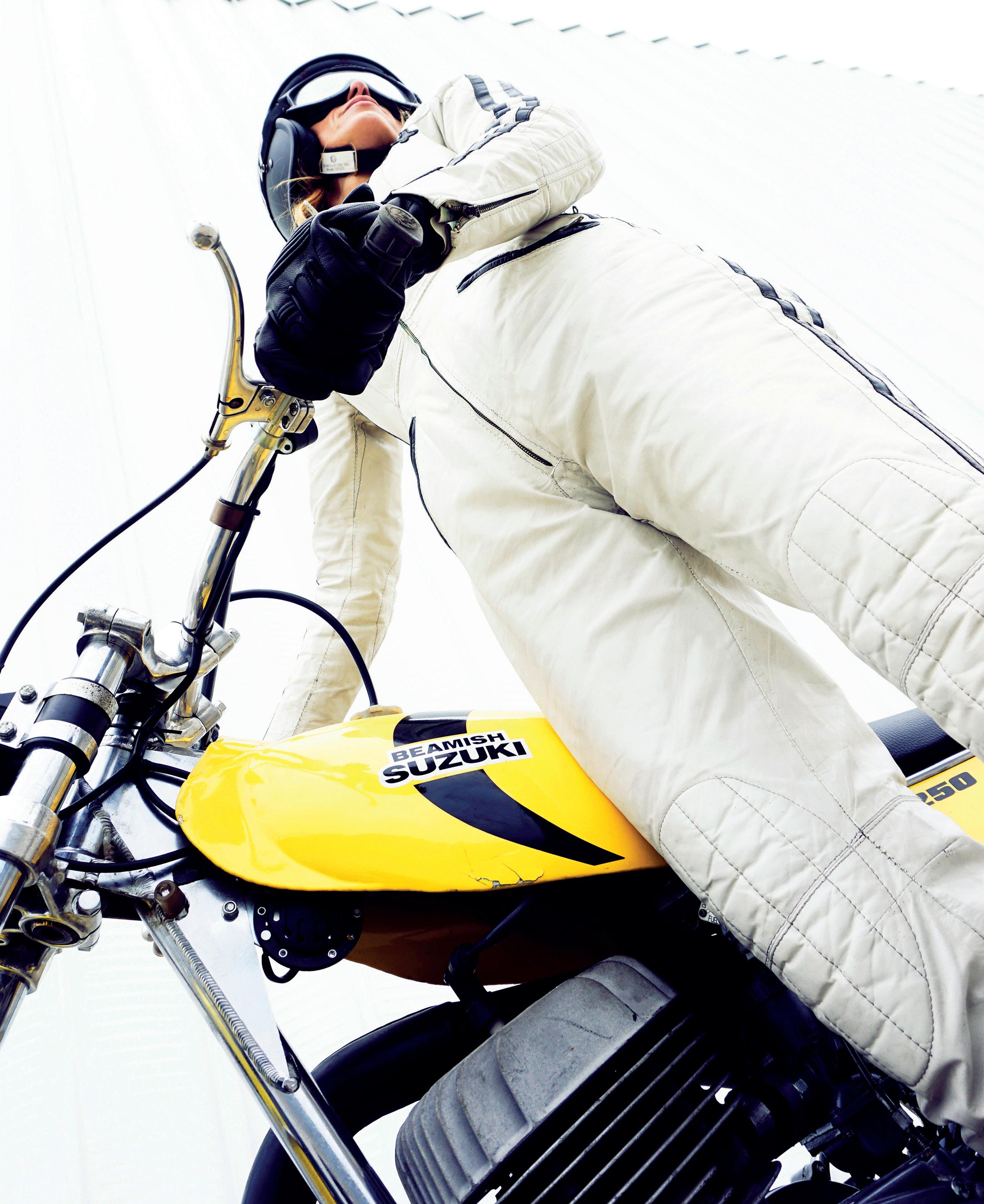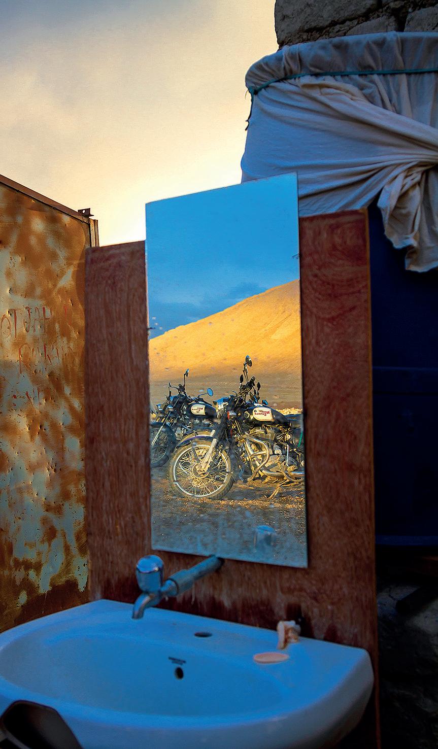 clockwise from top left: Cheetah and ‘Comet 45’ by Christine Gabler and Marc Holstein; ‘We brought all we love together: girls, motorbikes, fashion, for a kind of feminist Mad Max,’ says Nicolas Prado. Hubert Bastié is on Nicolas’s race bike; Washroom mirror reflection, Tso Kar, India, by Harsh Man Rai previous page: Hubert (again!) taking a Vitpilen down a Parisian staircase, by Jean-François Muguet