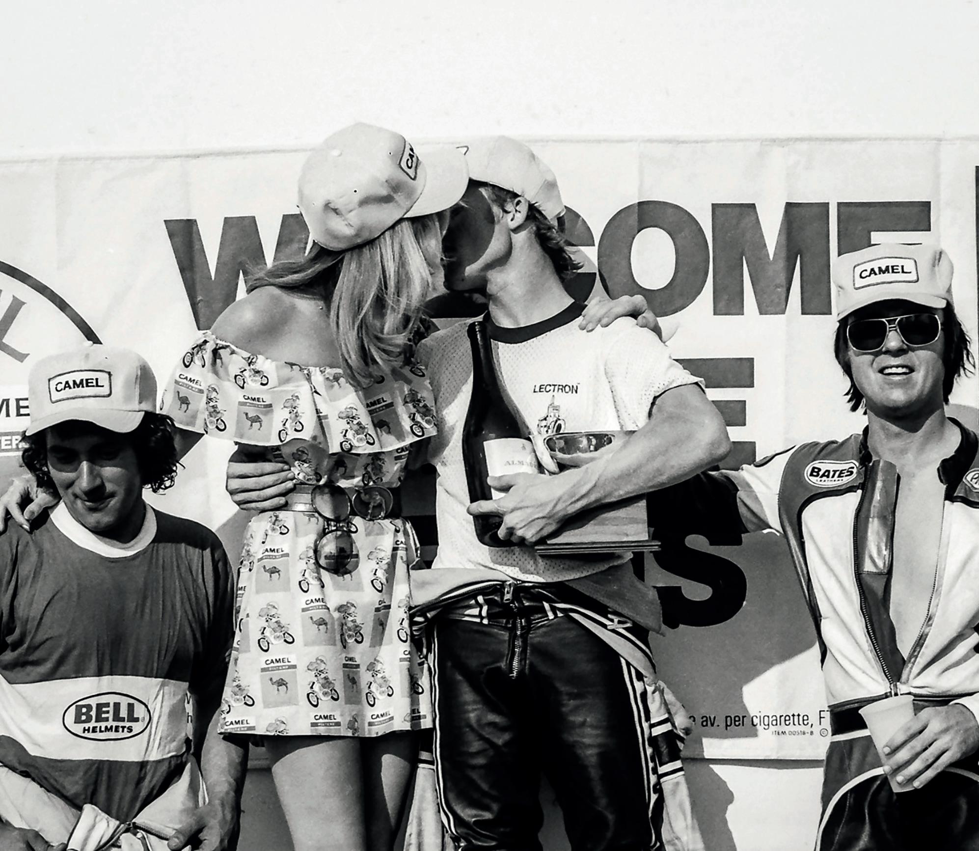 GN: This was at the Riverside Road Race in 1977. Kenny could not pop the plastic cork on the bottle of sparkling wine. Third-place finisher Steve McLaughlin stepped in to save the day and opened it for Kenny. The trophy queen, Lynn Griffis (Miss Camel Pro) was amused by it all, after receiving a big kiss from Kenny. All Kenny could do was shrug his shoulders as if to say, ‘I don’t know why, I have experience opening them, but not this cheap stuff.’ I don’t know if Kenny was frustrated by it all or if he didn’t like it after he took a sip, he then drained the wine on the ground. Lynn, second-placed David Aldana, and third-placed Steve McLaughlin were all amused by Kenny’s actions.