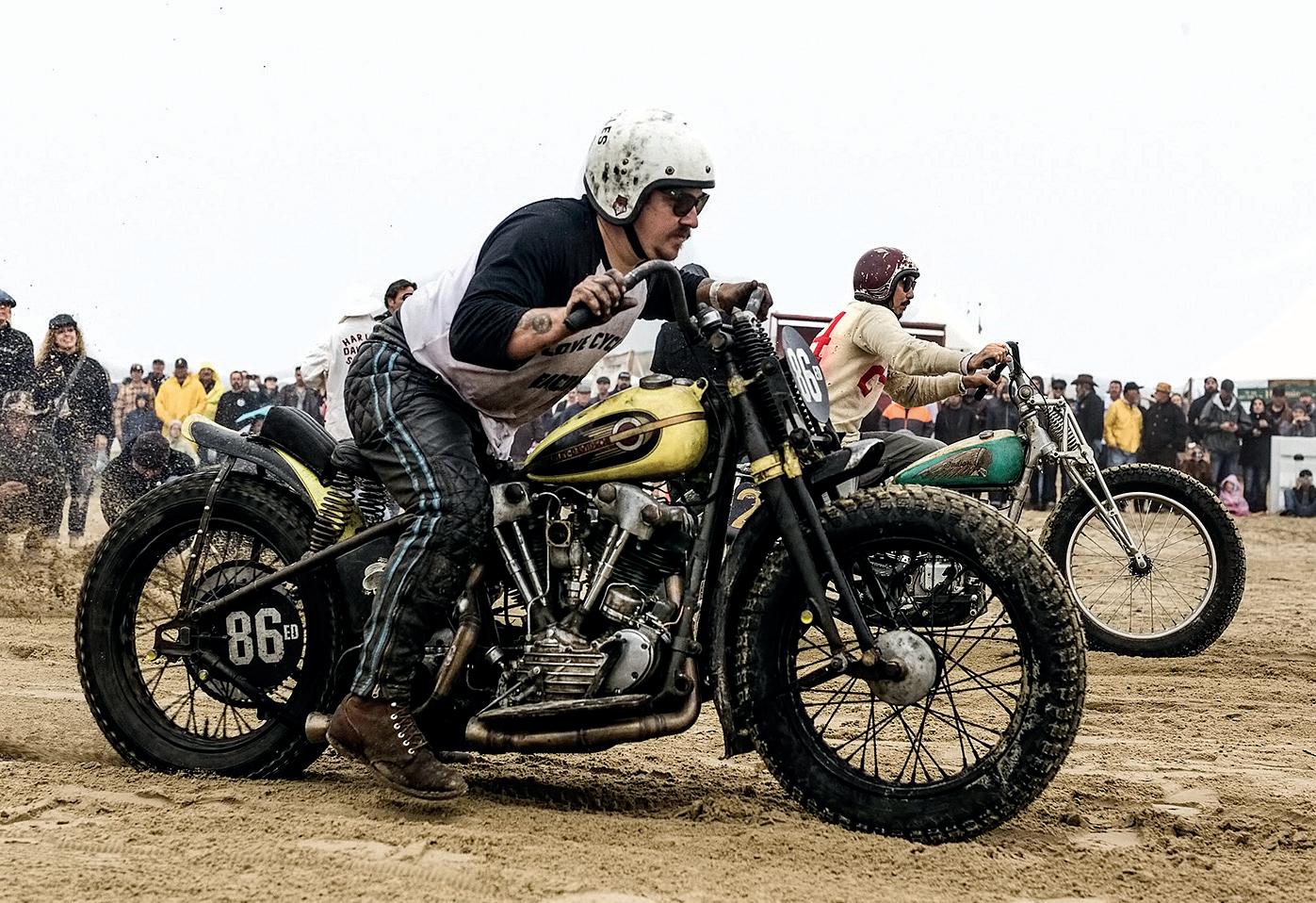 by Marc Holstein and Christine Gabler; Roland Sands getting down with a vintage Indian Scout at the Born Free Stampede, Costa Mesa, CA. Photo by Mark Kawakami
