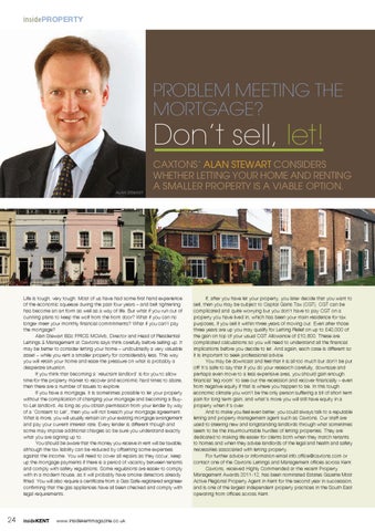 Life is tough, very tough. Most of us have had some first hand experience of the economic squeeze during the past four years – and belt tightening has become an art form as well as a way of life. But what if you run out of cunning plans to keep the wolf from the front door? What if you can no longer meet your monthly financial commitments? What if you can’t pay the mortgage? Alan Stewart BSc FRICS MCIArb, Director and Head of Residential Lettings & Management at Caxtons says think carefully before selling up. It may be better to consider letting your home – undoubtedly a very valuable asset – while you rent a smaller property for considerably less. This way you will retain your home and ease the pressure on what is probably a desperate situation. If you think that becoming a ‘reluctant landlord’ is for you to allow time for the property market to recover and economic hard times to abate, then there are a number of issues to explore. If you have a mortgage, it is sometimes possible to let your property without the complication of changing your mortgage and becoming a Buyto-Let landlord. As long as you obtain permission from your lender by way of a ‘Consent to Let’, then you will not breach your mortgage agreement. What is more, you will usually remain on your existing mortgage arrangement and pay your current interest rate. Every lender is different though and some may impose additional charges so be sure you understand exactly what you are signing up to. You should be aware that the money you receive in rent will be taxable, although the tax liability can be reduced by offsetting some expenses against the income. You will need to cover all repairs as they occur, keep up the mortgage payments if there is a period of vacancy between tenants and comply with safety regulations. Some regulations are easier to comply with in a modern house, as it will probably have smoke detectors already fitted. You will also require a certificate from a Gas Safe-registered engineer confirming that the gas appliances have all been checked and comply with legal requirements.