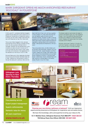 The produce-lead menu will offer dishes such as Smoked Coley Brandade, Dressed Crab with Harrisa and Toast, Josper Mussels, local Rock Oysters, Whelks and Cockles. Main dishes come with a choice of accompaniments such as Green Rocksalt Restaurant & Bar celebrates the finest Sauce, Peppercorn sauce or ‘Rocksalt Steak local produce and the best the British Isles has Sauce’, Spiced New Carrots, Braised Peas with to offer, whether from the farmland of Kent or Gem Lettuce or Runner Beans, and Minted the sea the restaurant overlooks. Mark and1 his14/6/11 Jersey16:29 Royals orPage Duck Fat J?????_Ream_Ad_Kent_Life:Layout 1 Chips.