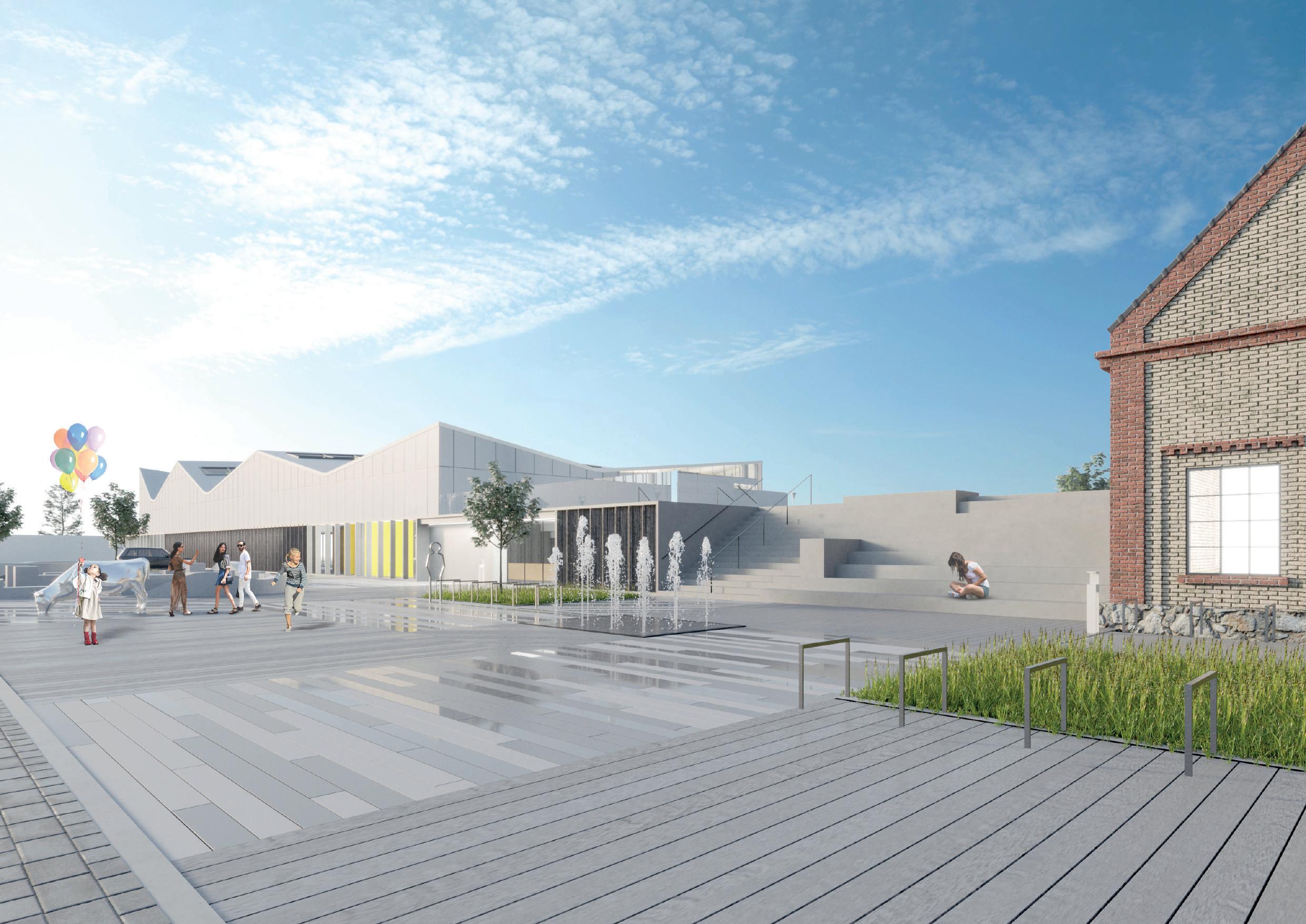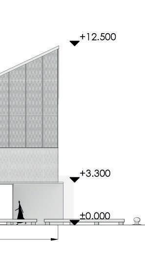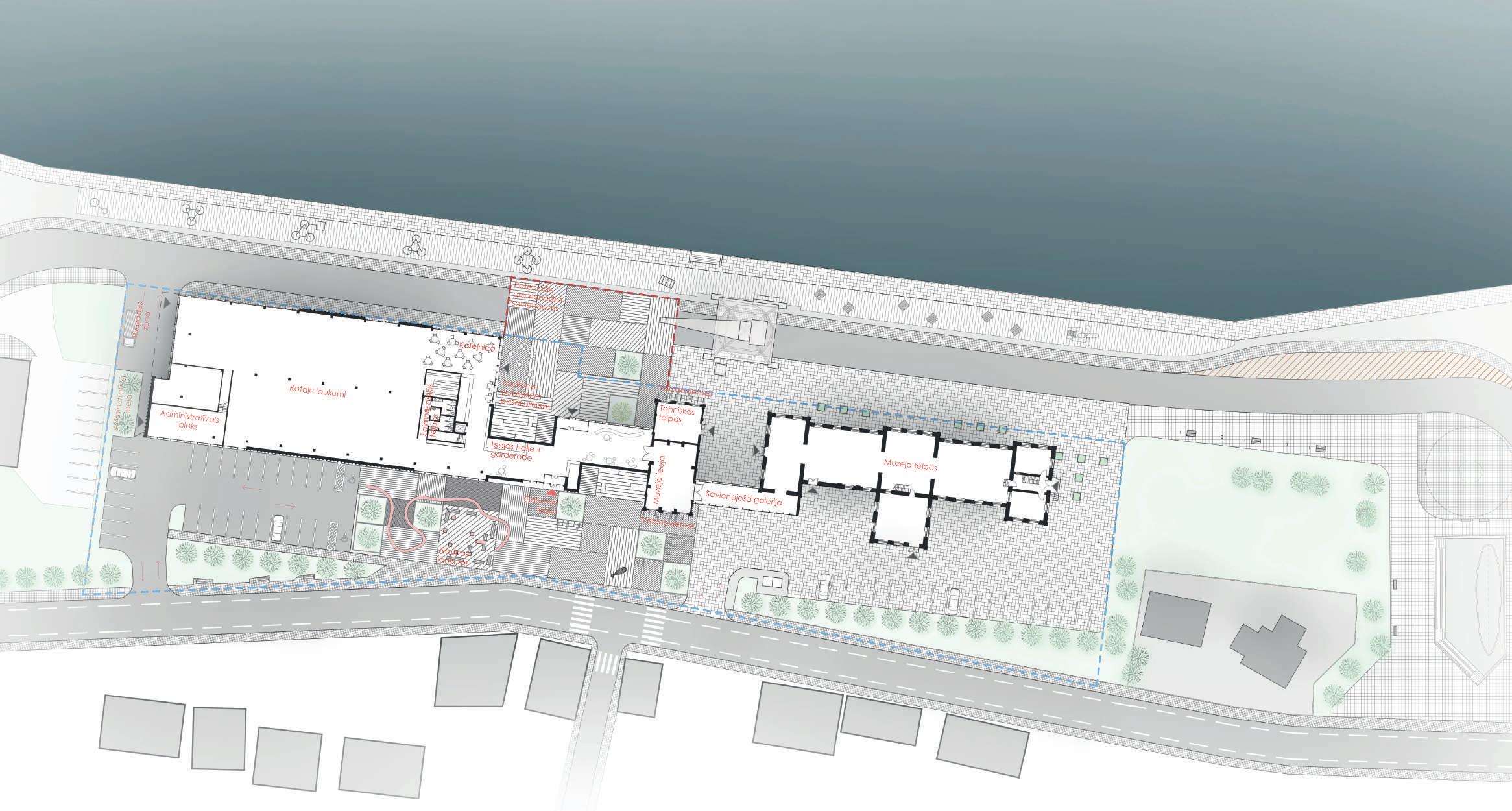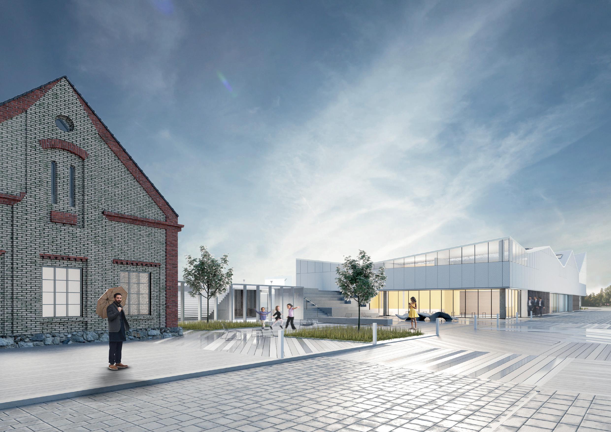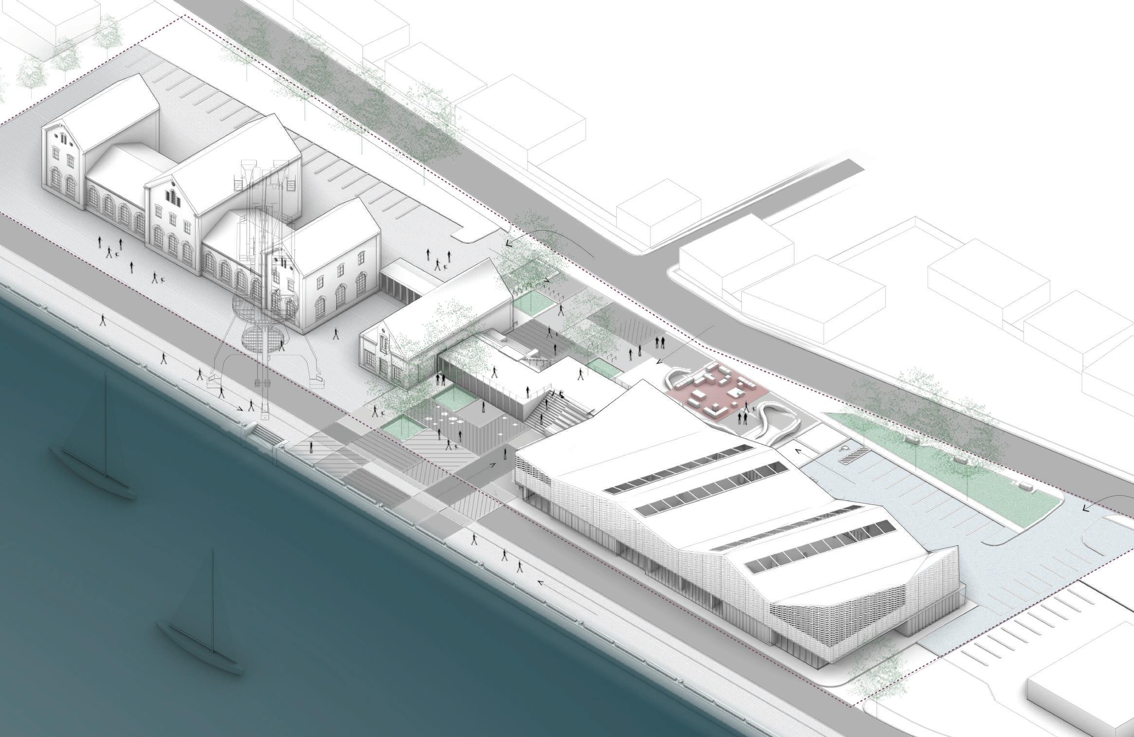 Jaunbūvējamie apjomi – tiek izveidots jaunbūvējams halles/ieejas mezgla apjoms starp abām ēkām, kas vienlaikus pilda arī garderobes un info centra funkciju. Ārtelpā šis apjoms kalpo kā savienojums starp Kr. Valdemāra un ostmalas promenādi, vienlaikus radot iespēju ārtelpas publisko pasākumu norisei ar sēdvietām uz pakāpieniem un skatu plat formu uz apjoma jumta. Papildus tiek izveidots galerijas veida savienojums starp smēdes ēku un darbnīcas apjomu, atjaunojot vēsturiskās ailu vietas.