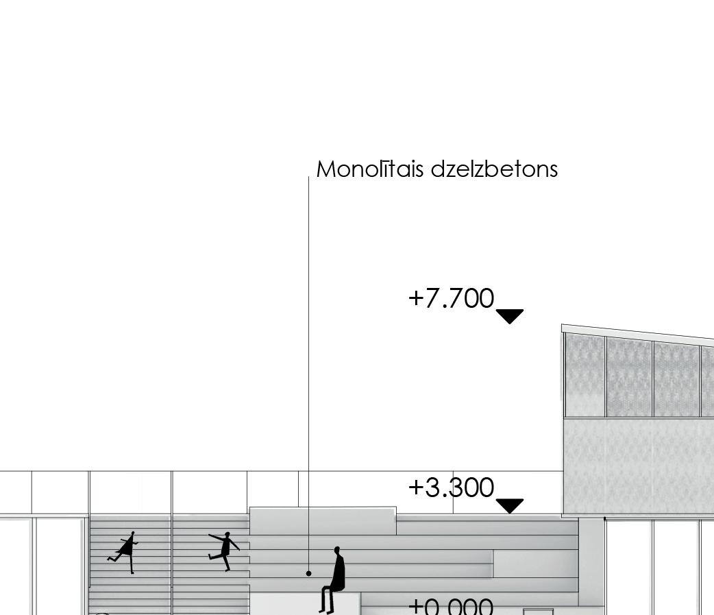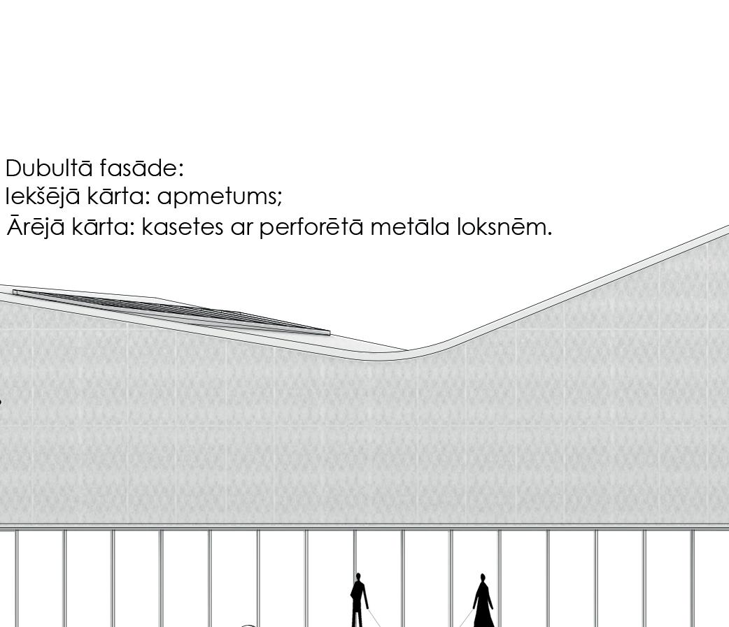 Būvkonstrukciju principiālo risinājumu apraksts Ēkas būvkonstrukcijas risinātas izmantojot esošās ēkas konstruktīvo sistēmu – esošās betona kolonnas, papildinot tās ar projektētām jaunbūvējamām jumta konstrukcijām – metāla kopnēm. Jaunajiem savienojošiem apjomiem tiek izman totas monolīta betona konstrukcijas, kombinētas ar alumīnija iekārtās fasādes sistēmām.