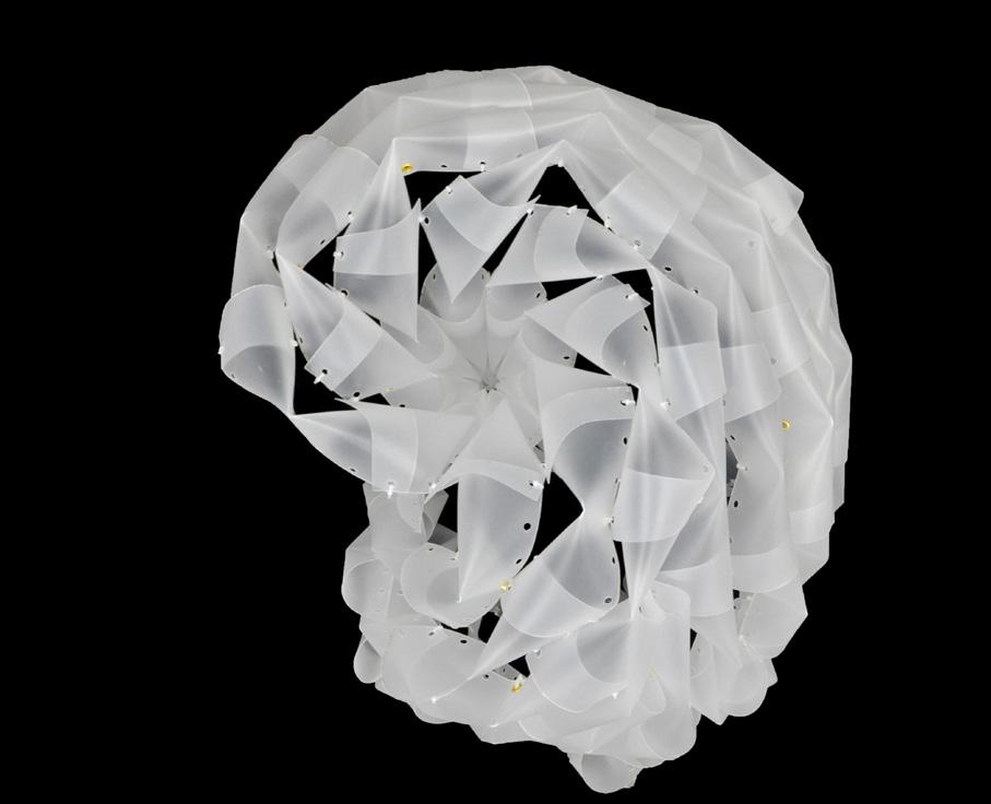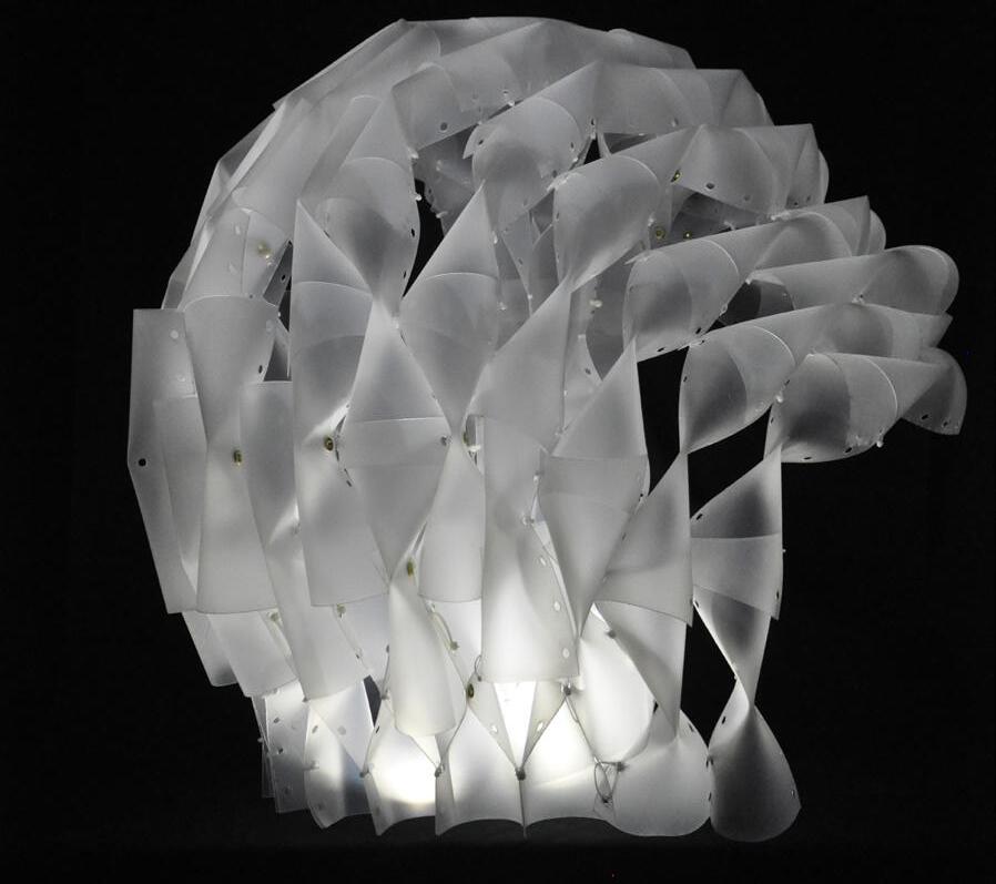 The translucent Polypropylene allowed an evocative play of light and shadow. Concurrently, its anisotropic material quality enabled the creation of a self-supporting structure when manipulated with certain folding techniques. Thus creating a continuous transition from column to roof and wall.