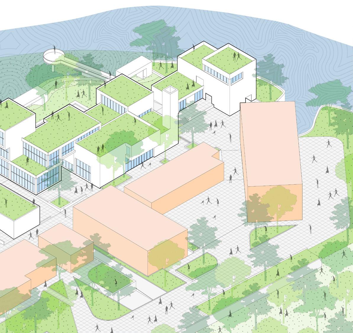 Repurposing eight blocks to provide programmable areas, amenity spaces, open space and farmable land to provide food for the people living on the central block