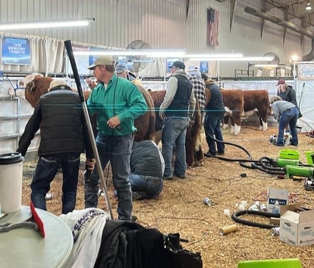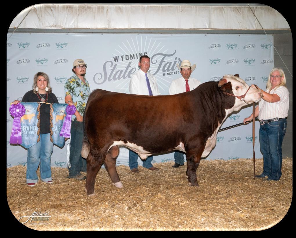 Quentin is a unique breeding piece at our operation. He brought many things to the table we had been looking for. Our goal was to have a bull that was heifer safe, would cross well on the Rip daughters, work on mature cows, and give us a type of cattle we had not had before. Quentin met all those expectations as well as outstanding performance in the show ring. He was the 2021 Res. National Champion Horned bull, a member of the 2021 National Res. Champion Pen of 3 Bulls, and then moved to Colorado. He was turned out to breed heifers, and we pulled him in 60 days prior to his next show. He was named 2021 Wyoming State Fair Supreme Champion Bull. This picture was taken mid-August after having been out breeding. Rylee Barber refers to this as our pasture picture of Quentin! We only wish our pastures looked that good!