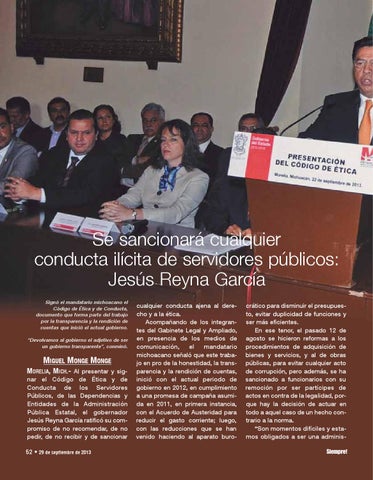 Miguel Monge Monge Morelia, Mich.- Al presentar y signar el Código de Ética y de Conducta de los Servidores Públicos, de las Dependencias y Entidades de la Administración Pública Estatal, el gobernador Jesús Reyna García ratificó su compromiso de no recomendar, de no pedir, de no recibir y de sancionar 52 • 29 de septiembre de 2013