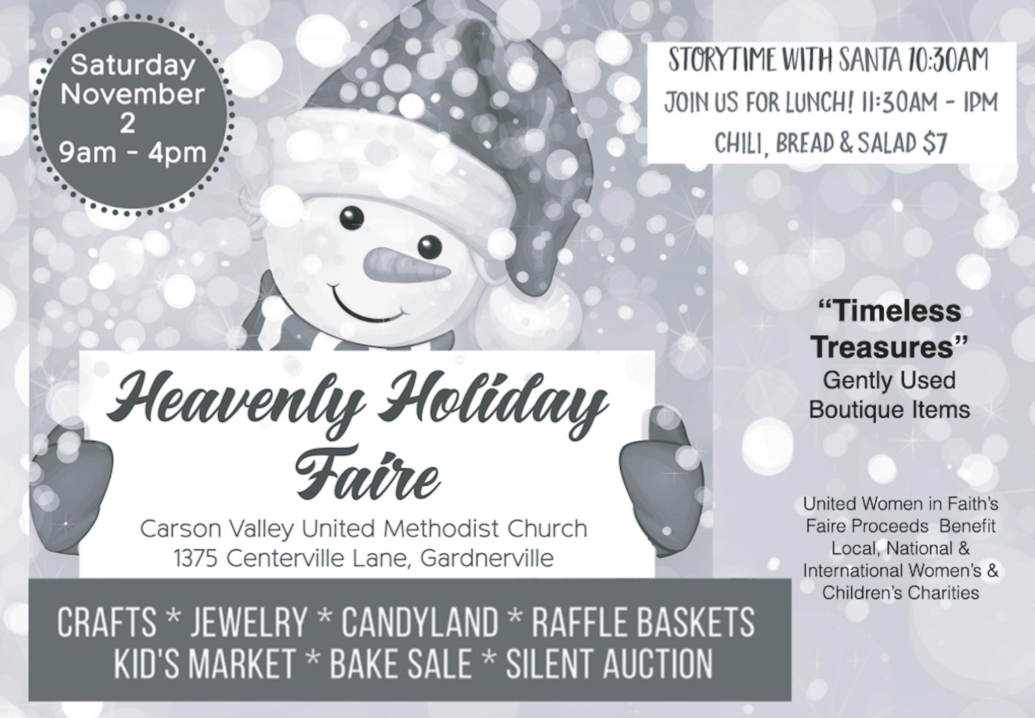 First weekend in November! Christmas Decor, Trees, Ornaments, Gifts, Bake Sale, Silent Auction, Raffle AND Santa! Get your pets picture taken with Santa! 1343 Centerville Lane, Gardnerville, St .Gall Church.