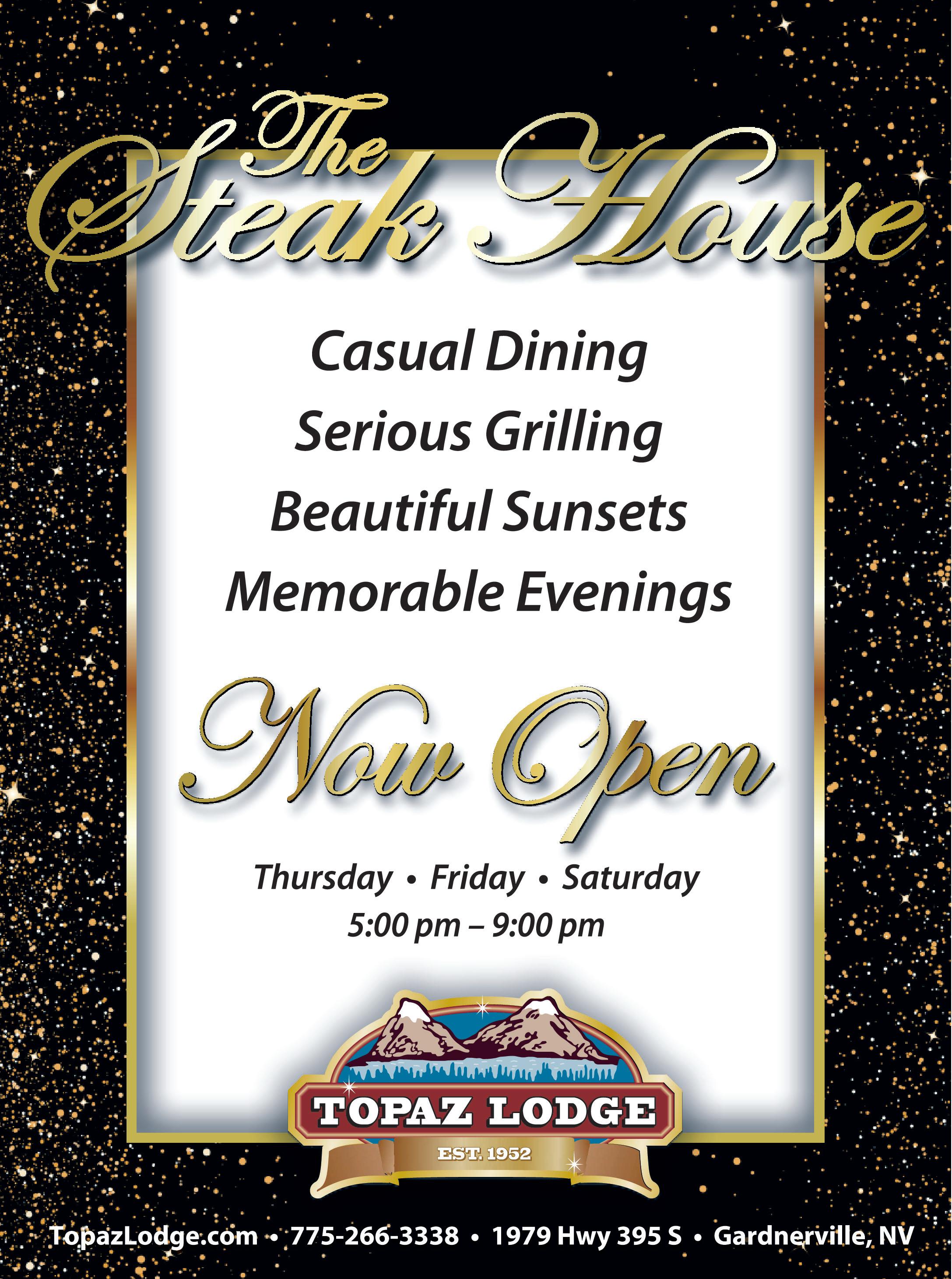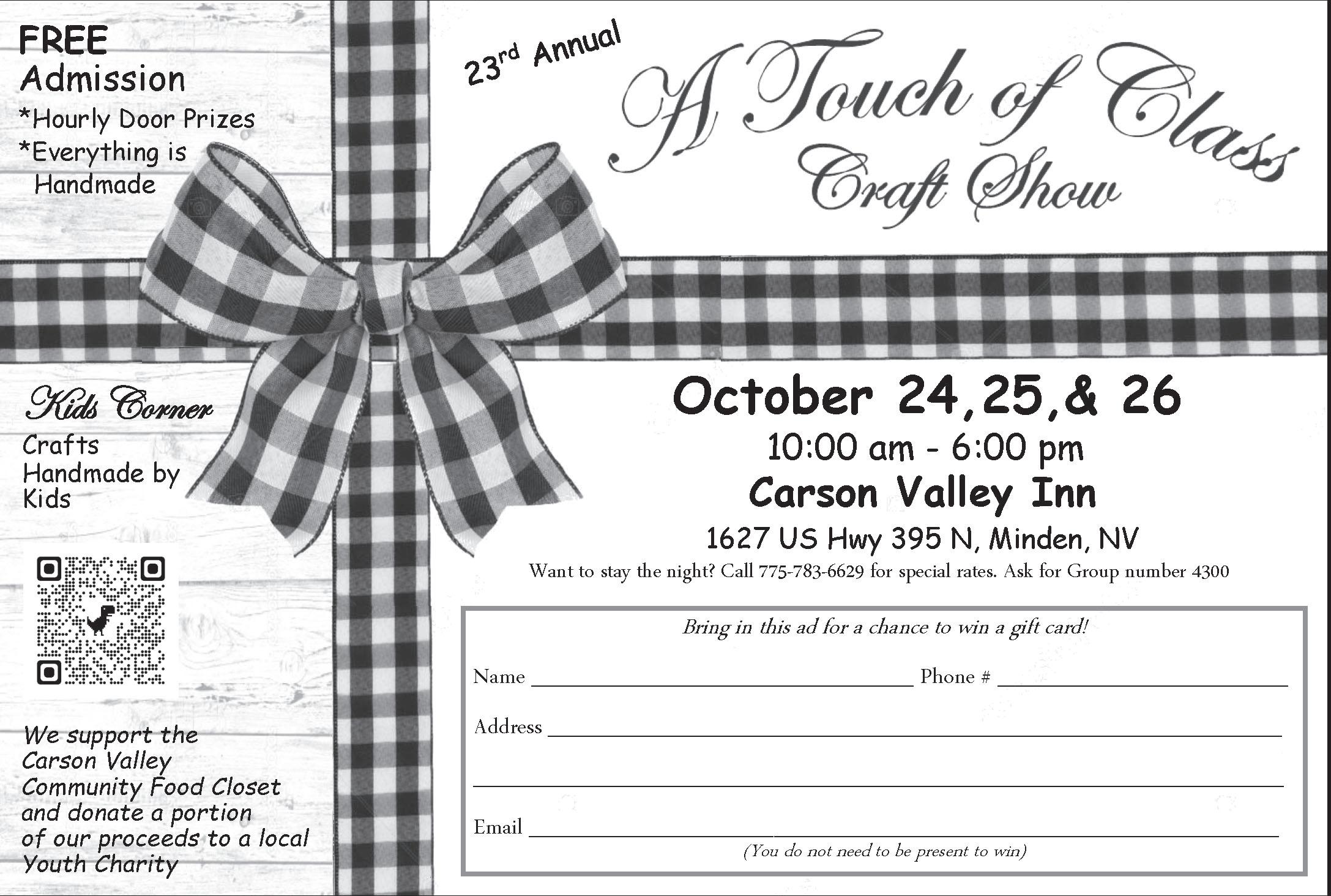 The Carson Valley Women’s Golf Club ... is holding a benefit golf tournament, Teeing Up For The Cure, on Saturday, October 12th at the Carson Valley Golf Course. The cost is $100/person which includes your green free, golf cart, swag bag, and lunch. Shotgun start is 10:00 a.m. Play will include the option of purchasing team mulligans, a 5-card draw poker run, three closest to the pin competitions, and a longest drive competition for both men and women divisions. There will be both a raffle prize drawing and silent auction with prizes that include two rounds of golf at Edgewood. Carson Tahoe Regional Hospital is a not-for-profit hospital that relies on the generosity of the community to help it remain independent and solvent. To help them continue to achieve that goal, all proceeds from the golf tournament will benefit and support the Carson Tahoe Cancer Center Breast Fund’s efforts to help women in their breast cancer recovery journeys. Contact Carson Valley Golf Course at (775) 265-3181 or visit www.carsonvalleygolf. com to reserve your spot and make a difference in someone’s life. Only checks or cash will be accepted for payment. Unfortunately, we are unable to accept credit cards.
