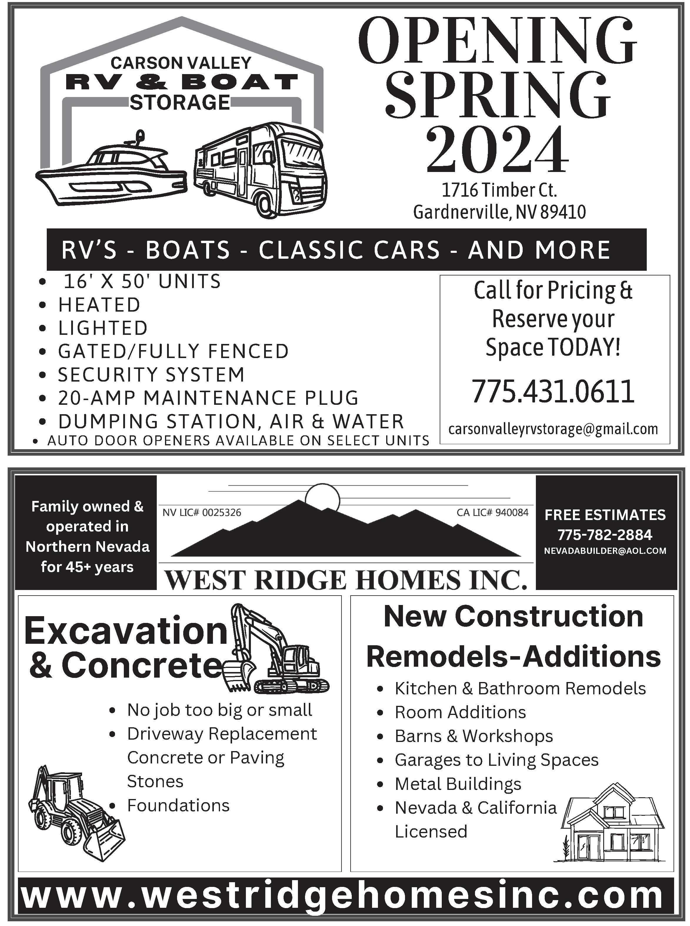 The Carson Valley Women’s Golf Club ... is holding a benefit golf tournament, Teeing Up For The Cure, on Saturday, October 12th at the Carson Valley Golf Course. The cost is $100/person which includes your green free, golf cart, swag bag, and lunch. Shotgun start is 10:00 a.m. Play will include the option of purchasing team mulligans, a 5-card draw poker run, three closest to the pin competitions, and a longest drive competition for both men and women divisions. There will be both a raffle prize drawing and silent auction with prizes that include two rounds of golf at Edgewood. Carson Tahoe Regional Hospital is a not-for-profit hospital that relies on the generosity of the community to help it remain independent and solvent. To help them continue to achieve that goal, all proceeds from the golf tournament will benefit and support the Carson Tahoe Cancer Center Breast Fund’s efforts to help women in their breast cancer recovery journeys. Contact Carson Valley Golf Course at (775) 265-3181 or visit www.carsonvalleygolf. com to reserve your spot and make a difference in someone’s life. Only checks or cash will be accepted for payment. Unfortunately, we are unable to accept credit cards.