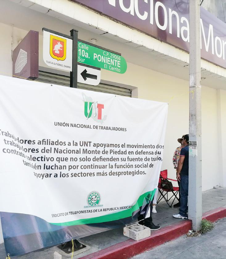 Tuxtla.- Desde hace como dos semanas y ante la falta de respuestas sus peticiones, cientos de trabajadores de la compañía de empeños “Nacional Monte de Piedad” continúa con una huelga que mantendrá hasta que les den soluciones positivas.