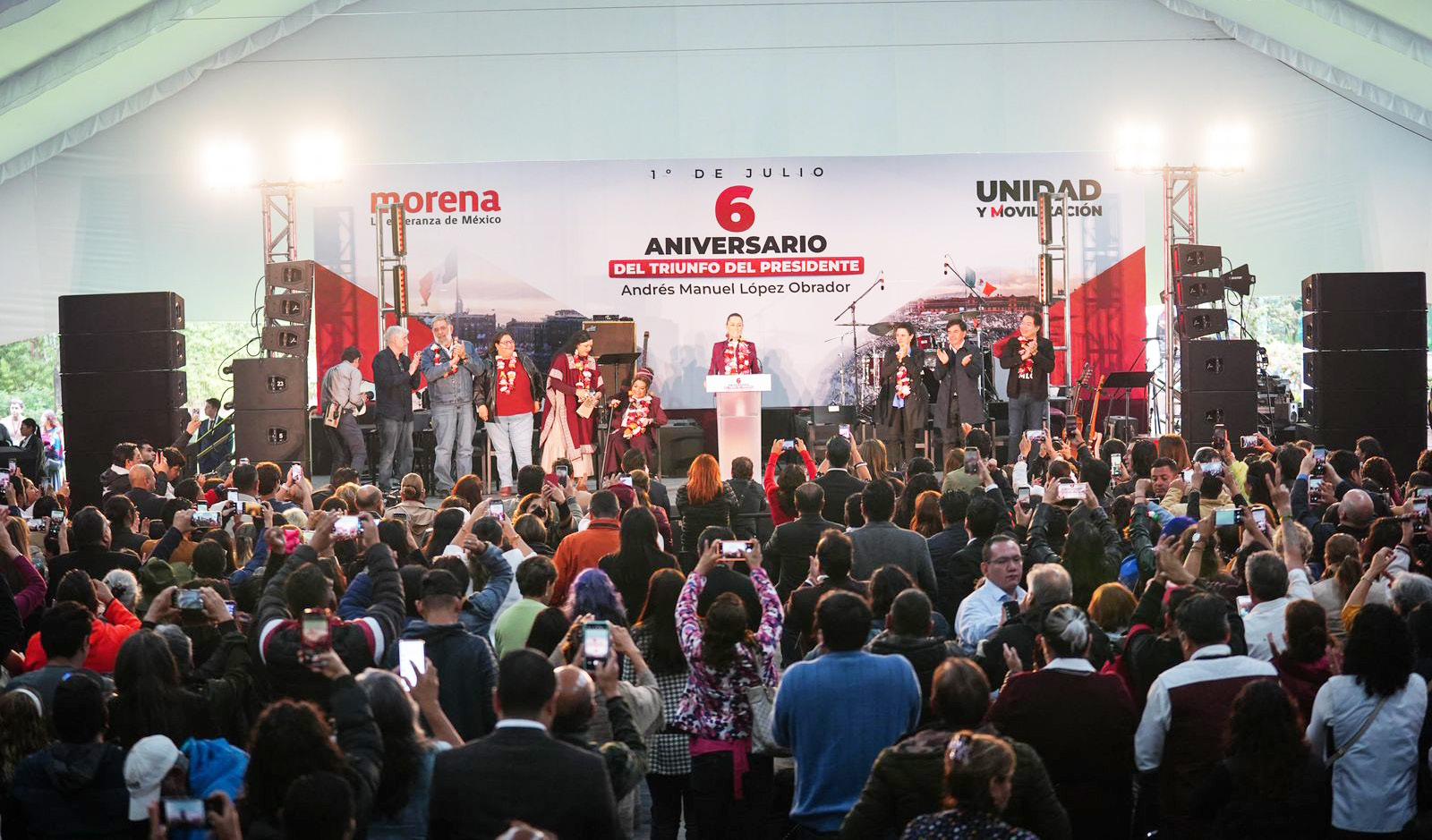 CDMX.-Festejar el triunfo histórico del 01 de julio de 2018 sin dejar la lucha social, fue el llamado de la virtual Presidenta electa de México, Claudia Sheinbaum Pardo, tras celebrar el sexto aniversario del triunfo de Andrés Manuel López Obrador por la Presidencia de la República, un día que convocó a conmemorar cada año como el Día de la Revolución de las Conciencias o el Día del Triunfo del Pueblo de México.