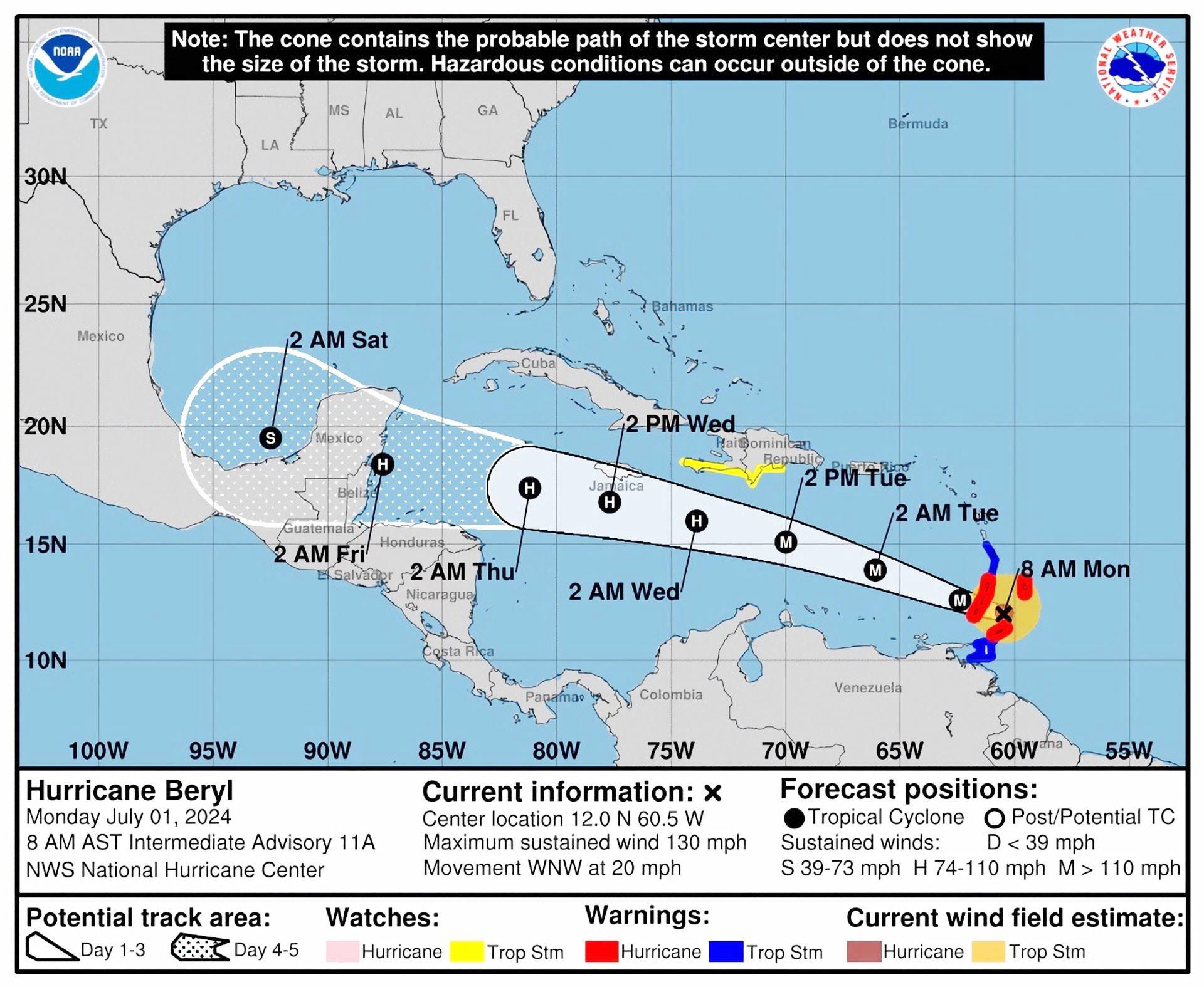Miami.- El “potencialmente catastrófico” huracán Beryl escaló a la categoría 5 en el este del mar Caribe, informó este lunes el Centro Nacional de Huracanes (NHC, en inglés) de Estados Unidos. “Se espera que traiga vientos que amenacen la vida y marea ciclónica a Jamaica más tarde esta semana”, ahondó el NHC a través de su página web.