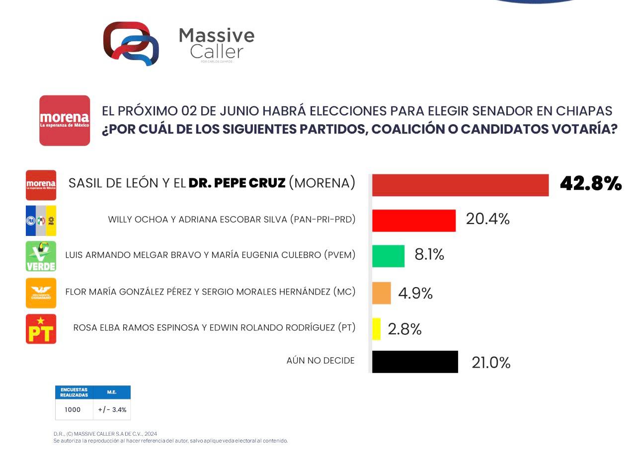 La encuesta realizada por la empresa Massive Caller se realizó de forma aleatoria por medio de llamadas telefónicas a través de la pregunta, ¿por cuál de los siguientes partidos, coalición o candidatos votarías?, donde se acentúa de forma contundente la preferencia del pueblo por el candidato de Morena, Dr. Pepe Cruz. Estos resultados son una prueba de que la gente está convencida que el Dr. Pepe Cruz representa la continuidad en la unidad, la justicia social, los beneficios y progreso de las y los chiapanecos hasta los rincones más alejados, sin dejar a nadie atrás ni afuera.