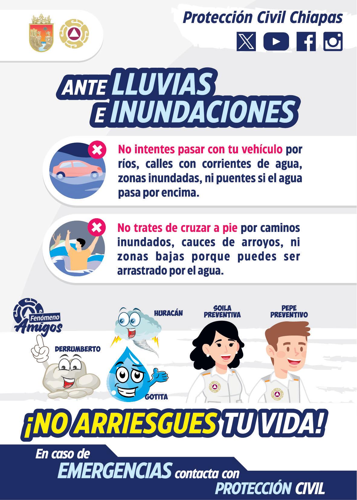 línea de baja presión que se encuentra en el Golfo de México que también contribuye a la inestabilidad en la región” También explicó que en el Soconusco se esperan precipitaciones de 100 a 150 mm, al igual que la zona alta de los Valle Zoque, Frailesca y en la mayoría del área de Mezcalapa, Norte y Selva . En Metropolitana, Bosques, Meseta Comiteca Llanos y Altos, se espera que sea principalmente de 50 a 100 mm. Se esperan máximas de 37 °C en las regiones más calurosas y 12 °C como mínimas en las zonas de montaña. La especialista de la CONAGUA, sostuvo que se mantienen en vigilancia las presas del estado en coordinación con Comisión Federal de Electricidad (CFE), las cuales se encuentran en niveles controlados.