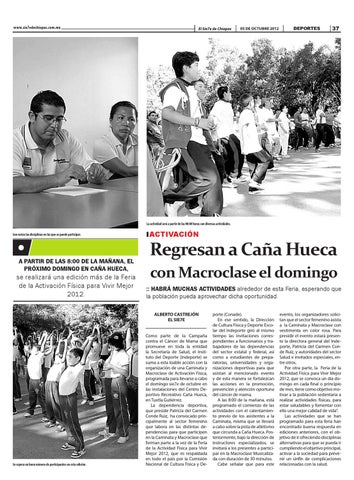 evento, los organizadores solicitan que el sector femenino asista a la Caminata y Macroclase con vestimenta en color rosa. Para presidir el evento estará presente la directora general del Indeporte, Patricia del Carmen Conde Ruiz, y autoridades del sector Salud e invitados especiales, entre otros. Por otra parte, la Feria de la Actividad Física para Vivir Mejor 2012, que se convoca un día domingo en cada final o principio de mes, tiene como objetivo motivar a la población sedentaria a realizar actividades físicas, para estar saludables y fomentar con ello una mejor calidad de vida”. Las actividades que se han programado para esta feria han encontrado buena respuesta en ediciones anteriores, con el objetivo de ir ofreciendo disciplinas alternativas para que se pueda ir cumpliendo el objetivo principal, activar a la sociedad para prevenir un sinfín de complicaciones relacionadas con la salud.
