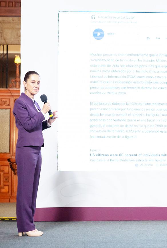 “Las propias cifras de la Oficina de Aduanas y Protección Fronteriza de ese país (CBP, por sus siglas en inglés) muestran que las incautaciones de fentanilo en Estados Unidos provenientes de México se redujeron en 50 por ciento, de octubre de 2024 a enero de 2025”, destacó.