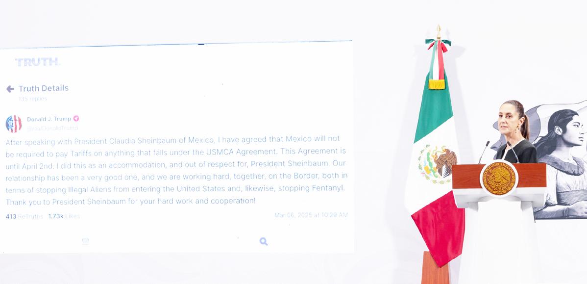 El acuerdo de que todos los productos que exporte México al amparo del TMEC queden exentos de aranceles hasta el próximo 2 de abril habla de un trato preferente y de un reconocimiento a la actitud responsablemente nacionalista de nuestra Presidenta, de la que debemos estar orgullosos todas y todos los mexicanos.