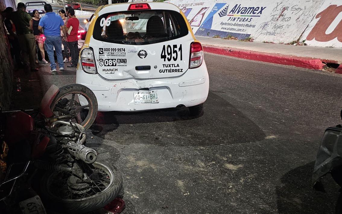 Tuxtla.- Un motociclista resultó con diversas heridas luego de estar involucrado en un accidente de tránsito sobre el Libramiento Norte a la altura de la 5ª calle Poniente, en la capital chiapaneca. El percance involucró a tres vehículo, una camioneta particular, un taxi y una motocicleta. El incidente ocurrió alrededor de las 22:30 horas, cuando los números de emergencia recibieron el reporte que alertaba sobre un choque múltiple, lo que movilizó a elementos de seguridad y auxilio hacia la zona. De acuerdo con versiones oficiales, los tres vehículos circulaban en el carril de baja velocidad con dirección de Poniente a Oriente, cuando antes de llegar a la intersección con la 5ª Poniente, el conductor de una camioneta particular impactó por alcance al motociclista y que fue proyectado contra la parte trasera de un taxi con número económico 4951. El motoris -