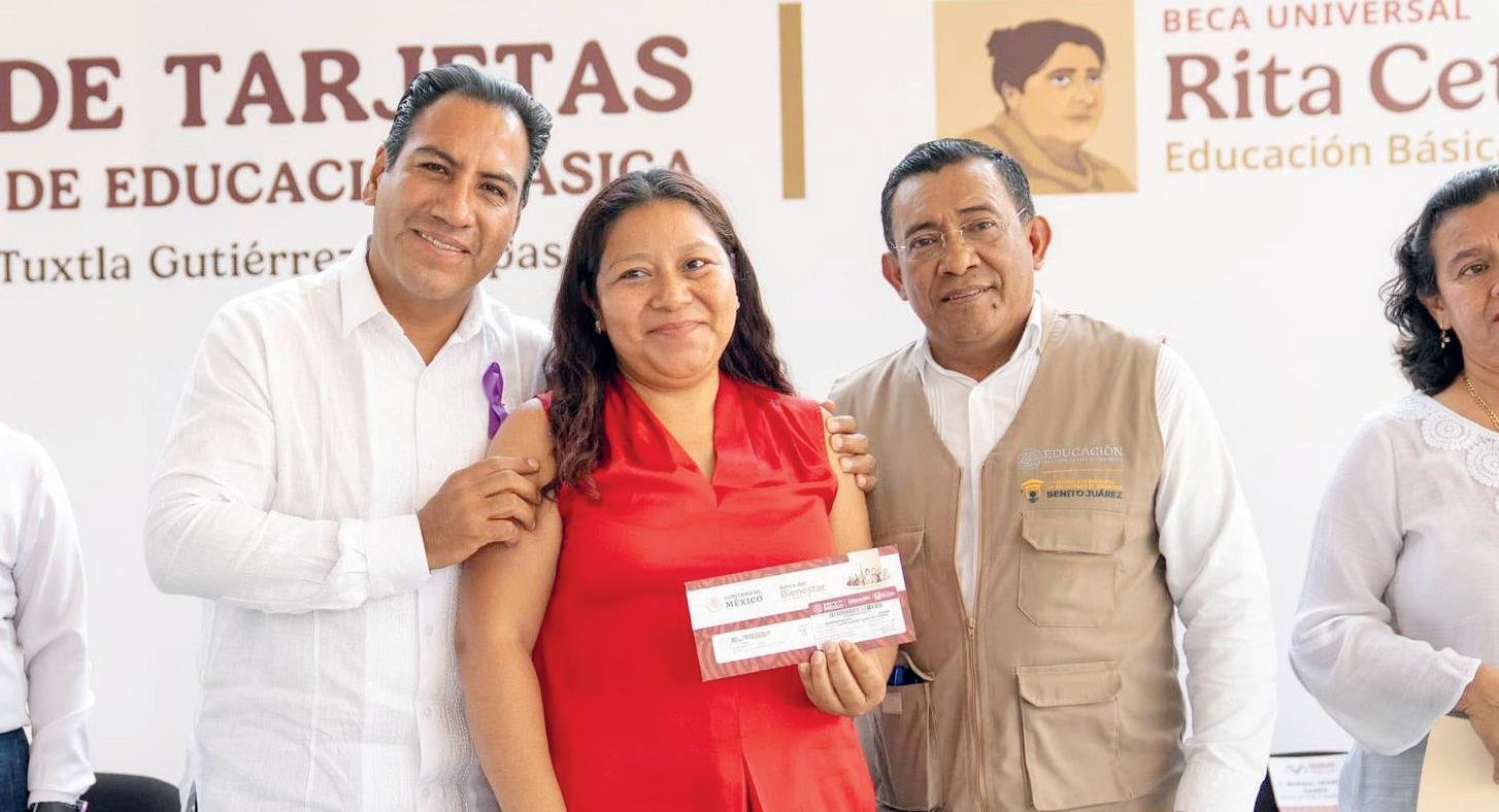 Tuxtla.- El gobernador Eduardo Ramírez Aguilar encabezó la entrega de tarjetas de la Beca Universal de Educación Básica Rita Cetina, cumpliendo así el compromiso que asumió públicamente el año pasado junto a la presidenta Claudia Sheinbaum, de coadyuvar para garantizar este apoyo a niñas, niños y adolescentes de todo el estado.