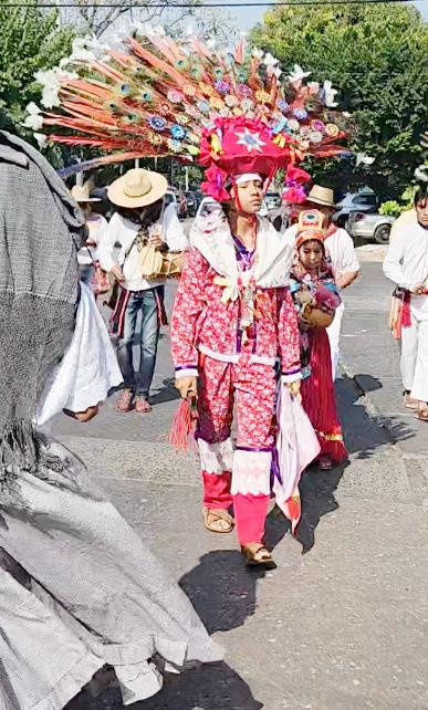 “Hoy nos tocó acompañar el baile, y vamos a hacerlo con todo gusto, es una bonita costumbre que nos dejaron nuestros ancestros, tiene muchos años, tenemos el privilegio de estar con los jóvenes más que nada, enseñándoles y motivándolos, queremos que no decaiga la tradición y salir adelante”, señaló, mientras dos jóvenes se colocaban el atuendo donde el color rojo predominaba y les ayudaban a ponerse el penacho. Alberto Juárez Cruz, es un joven de 16 años que este año bailó por primera vez, es hijo del maestro baile y admite que usar el penacho es un poco incómodo, porque se mueve mucho hacia los lados, pero se sintió muy bien, él es músico, alumno del maestro Juan, y fue su primera vez bailando, por lo que espera que se vuelva a repetir.