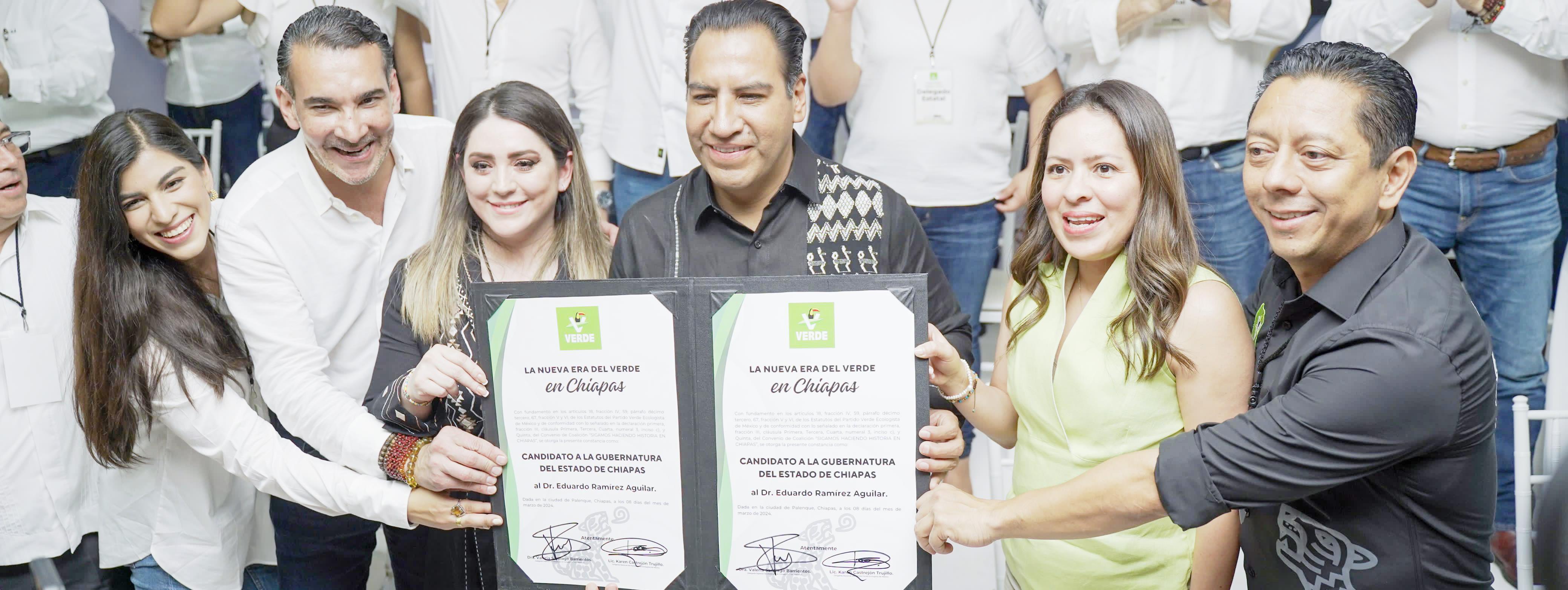 Tuxtla.- En asamblea estatal, tras una votación unánime, la dirigente nacional del Partido Verde Ecologista de México (PVEM), Karen Castrejón Trujillo y la presidenta del Comité Ejecutivo Estatal, Valeria Santiago Barrientos, entregaron a Eduardo Ramírez Aguilar la constancia de ratificación que lo avala