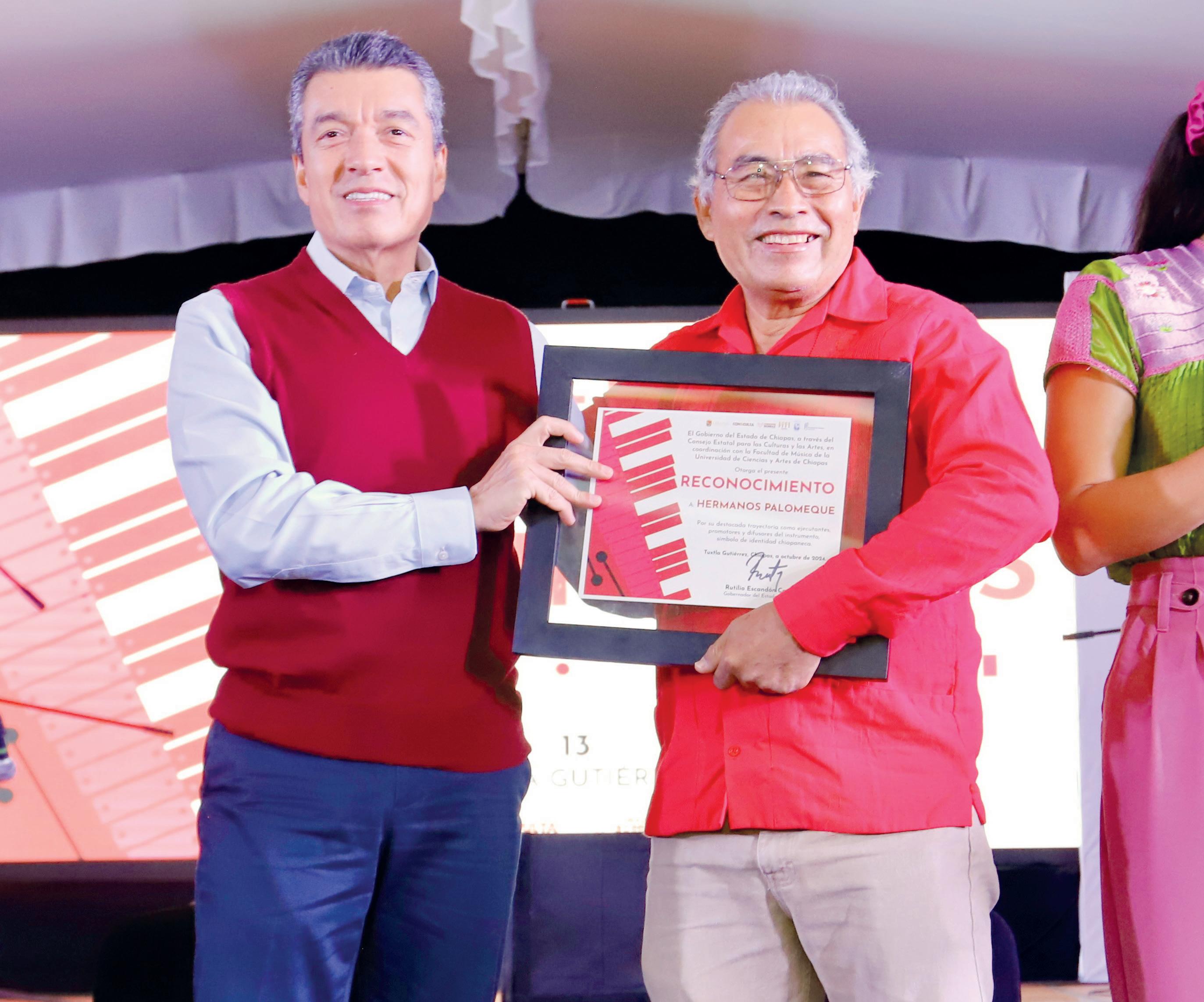 Luego de hablar de los orígenes de este instrumento y sus exponentes chiapanecos, como Corazón Borraz, el mandatario felicitó a las familias Palomeque y Nandayapa, las cuales fueron homenajeadas por ser dinastías dedicadas a tocar y construir marimbas: “Qué bueno que tienen asegurada la estafeta en las nuevas generaciones”, agregó. En nombre de Roberto Palomeque, fundador de la marimba Hermanos Palomeque, quien no asistió por cuestiones de salud, su hijo, Javier Palomeque, agradeció esta distinción y resaltó el compromiso que tienen al ser una familia que toda su vida se ha dedicado a la marimba: “Soy la tercera generación y ya está la cuarta, que son mis hijos. Gracias, gobernador, por darle la importancia a la marimba que nos