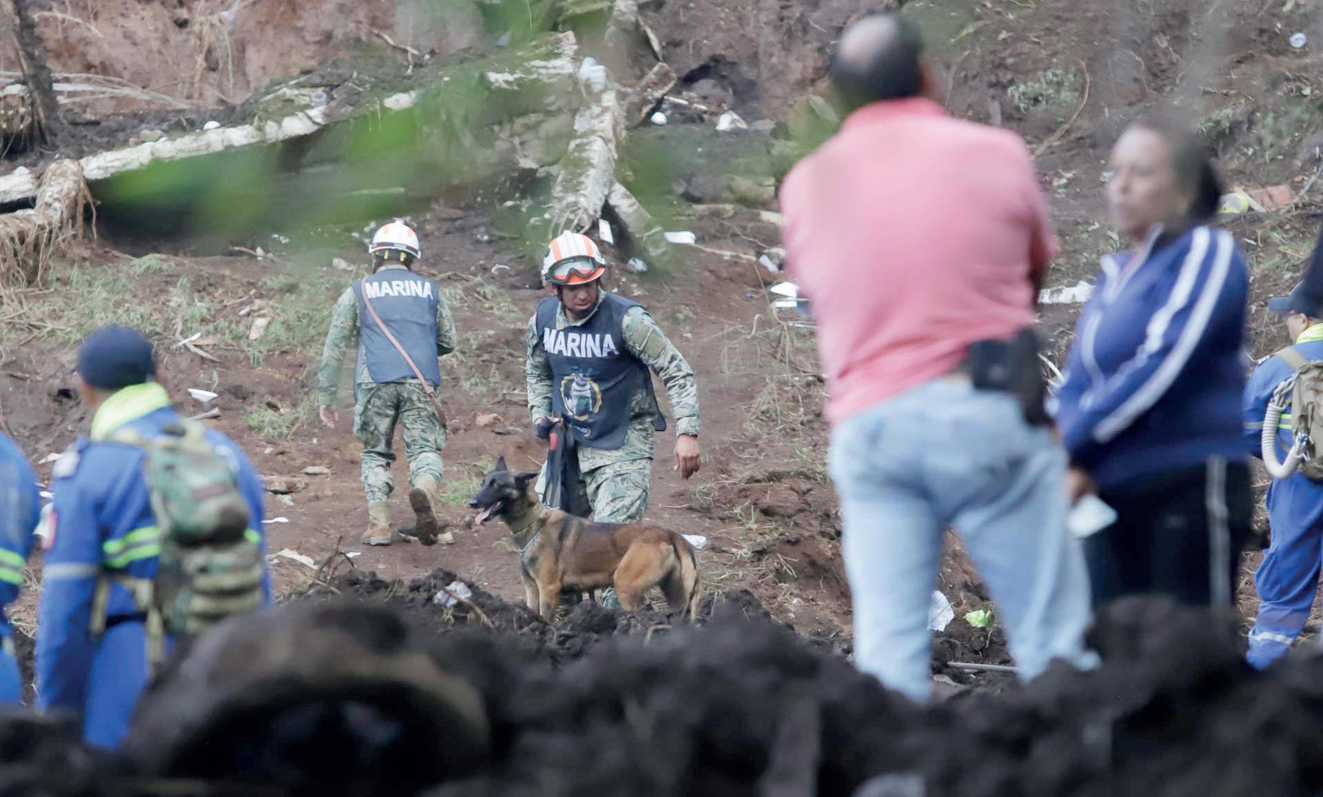 Entre los escombros, agentes del Ejército mexicano realizan búsquedas caninas para ubicar a los desaparecidos en esta colonia, ubicada al norte de Puebla, donde se han encontrado cinco personas muertas, integrantes de una familia completa, quienes quedaron sepultados bajo su vivienda.