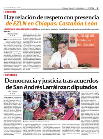 Democracia y justicia tras acuerdos de San Andrés Larráinzar: diputados TANIA BROISSIN EL SIE7E A 15 AÑOS de la firma de los Acuerdos de San Andrés Larrainzar entre el gobierno federal y el Ejercito Zapatista de la Liberación Nacional (EZLN), en busca de la dignidad de los pueblos indígenas, la diputada de la Zona Altos, María Gertrudis Hernández Hernández dijo que se ha logrado respetar los derechos, bienestar, desarrollo culturas indígenas, democracia y justicia. “Reconocemos que el gobierno que encabeza Juan Sabines Guerrero a hecho todo lo posible al llevar a cabo los Objetivos del Desarrollo del Milenio (ODM) y realizar acciones que se han concretado el empoderamiento de las mujeres en diversos ámbitos de la política de la entidad”. Manifestó que ella es un de los ejemplos de mujer indígena al tener un espacio en el Congreso del Estado y destacó las atenciones que se les ha brindado a dichas comunidades.