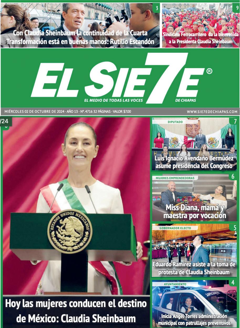 El Sie7e es impreso y distribuido por El Sie7e de Chiapas de S.A de CV. Numero de Certificado de Reserva otorgado por el instituto Nacional de Derechos de Autor: 04-2021-092016494100-101. Número de Certificado de Licitud de Título y Certificado: 16746.