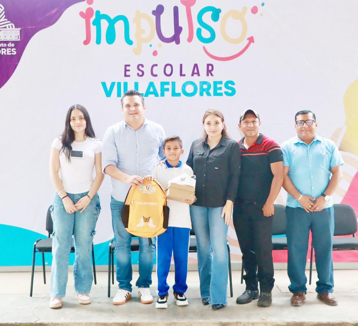 Villaflores.- Como parte del programa Impulso Escolar, que beneficia a más de 5 mil niñas y niños de 55 escuelas de todo el municipio, la alcaldesa de Villaflores, Valeria Rosales Sarmiento, encabezó la entrega de mochilas, útiles escolares y tenis a 241 estudiantes de las escuelas primarias Teodolinda Villalobos y