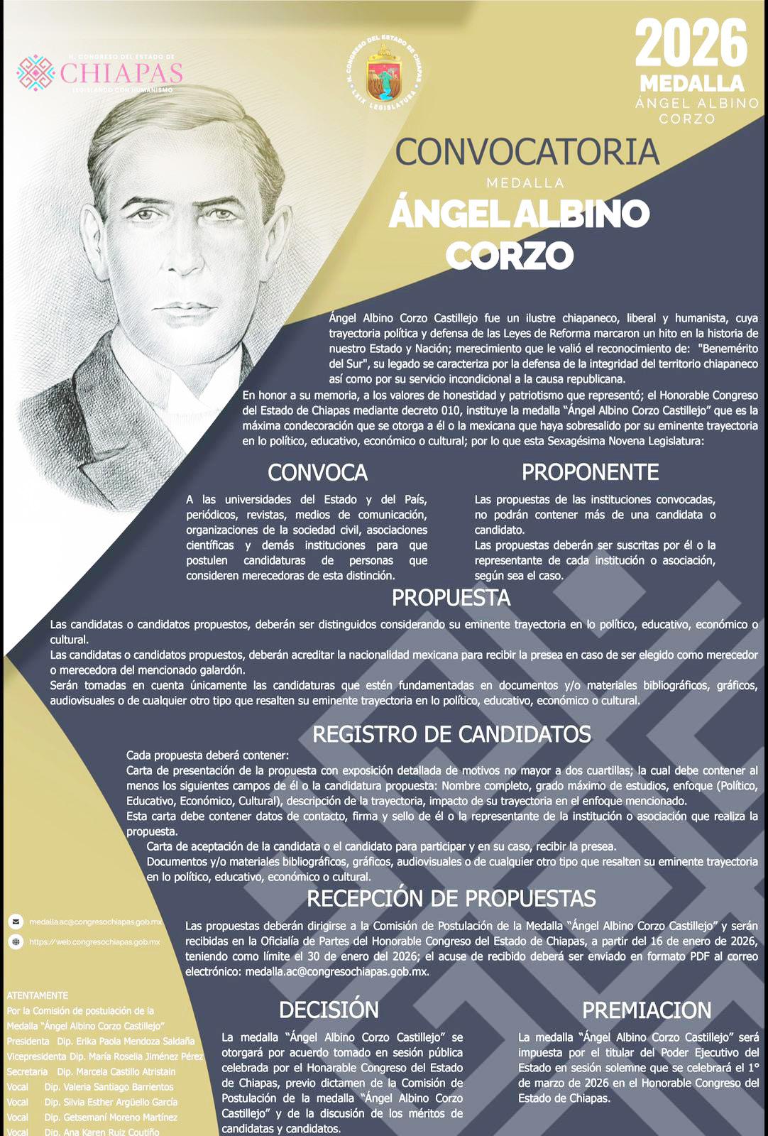 “Ángel Albino Corzo Castillejo” y serán recibidas en la Oficialía de Partes del Honorable Congreso del Estado de Chiapas, a partir del 16 de enero de 2026, teniendo como límite el 30 de enero del 2026; el acuse de recibido deberá ser enviado en formato PDF al correo electrónico: medalla.ac@congresochiapas.gob.mx.