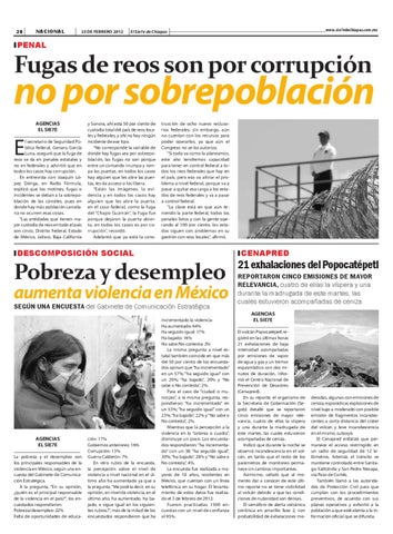 AGENCIAS EL SIE7E La pobreza y el desempleo son los principales responsables de la violencia en México, según una encuesta del Gabinete de Comunicación Estratégica. A la pregunta, “En su opinión, ¿quién es el principal responsable de la violencia en el país?”, los encuestados respondieron: Pobreza/desempleo: 22% Falta de oportunidades de educa-