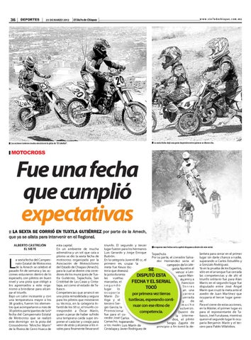 triunfo. El segundo y tercer Se esperan más fechas en la capital chiapaneca dentro de este serial. lugar fueron para los hermanos Luis Gerardo y Jorge Enrique lantera para cerrar en el primer Tapachula. Buitrón. lugar sin darle chance a nadie, Por su parte, el corredor SalvaEn la categoría Juvenil 80 cc, el superando a Carlos Estudillo y dor Hernández sería el primero en cruzar la a Gonzalo Rodríguez. campeón de la catemeta fue Kevin VicYa en la prueba de los Expertos, goría Novatos al SE toria que dominó sólo en el arranque fue cerrada vencer a Leola justa durante las competencias y de ahí el nardo ManDISPUTÓ ESTA las vueltas triunfo solitario fue para Alan dujano y a marcadas, el FECHA Y EL SERIAL Marín; en el segundo lugar fue Francisco segundo disputado entre José Ángel T o r r e s TOCÓ lugar lo Marín que cruzó la meta ante el en una ocuparía asedio de Juan Martínez que carrera por primera vez tierras Mario Zúocuparía el tercer lugar genecerrada ñiga y el tuxtlecas, esperando contiral. y de tercero SerPara el cierre de estas acciones, m u c h o nuar con ese ritmo de gio García; la en la Máster, el primer lugar es esfuerzo. Promocional competencia. para el representante de TaDentro de fue para el cobasco, Joel Furukawa, mientras la Intermerredor José Carlos que en el segundo lugar lo ocudios, el piloto Camacho, superando paría Benjamín Marín y el terSergio Zapata de a los rivales Luis Marín de cero para Pablo Villalobos. principio a fin tomó la deCintalapa y Javier Rodríguez de