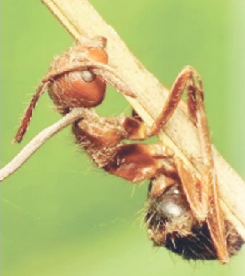 Este hongo parásito infecta hormigas camina-suelas en bosques tropicales. Tras crecer dentro de la hormiga, manipula su comportamiento: la obliga a abandonar la colonia, trepar la vegetación y clavarse a una hoja en una posición ideal para la esporulación del hongo. Luego el hongo consume al insecto y libera esporas desde la posición elevada, maximizando la dispersión. El proceso muestra una combinación de destrucción tisular y señuelos químicos que reprograman movimientos y rigidez muscular.